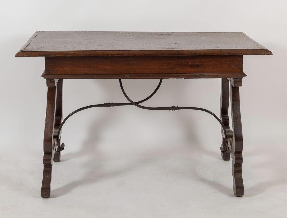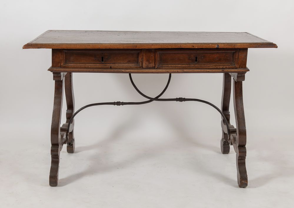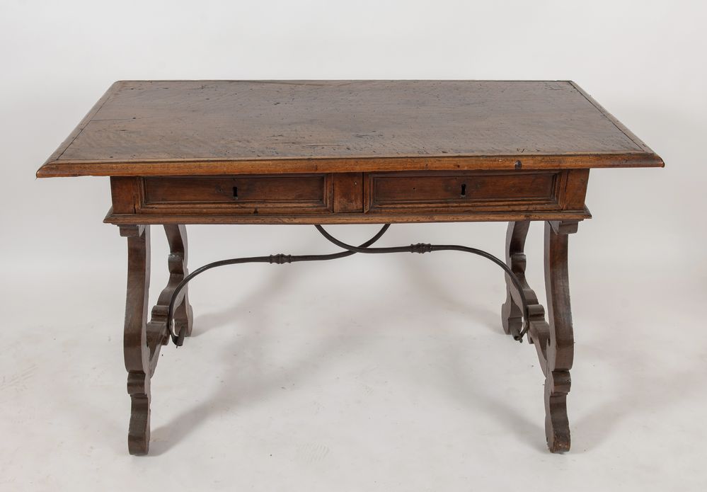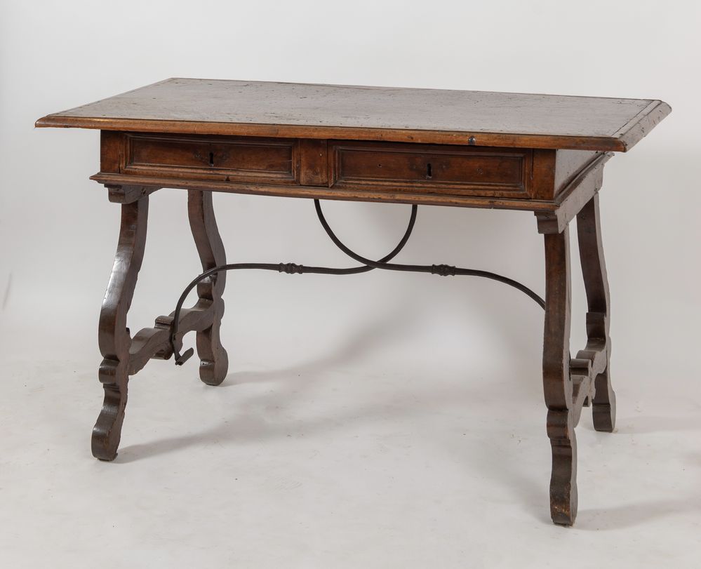SCRITTOIO a lira in massello di noce. Lombardia, XVII secolo. Cm 84x134x70.