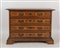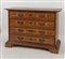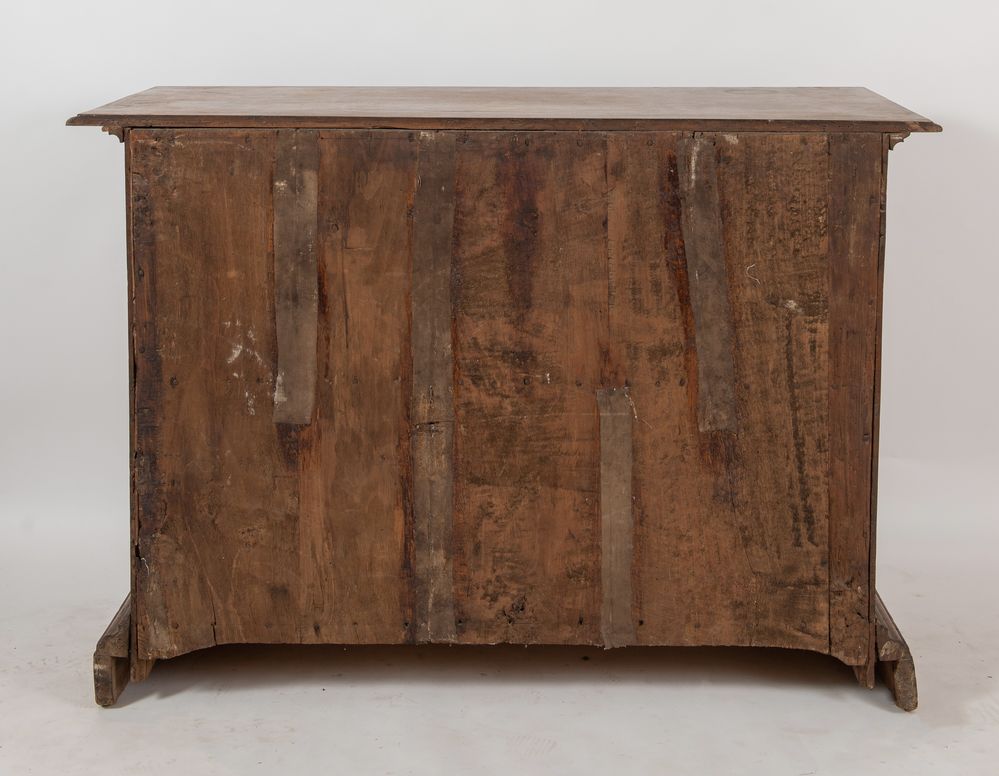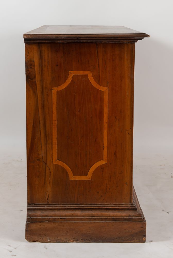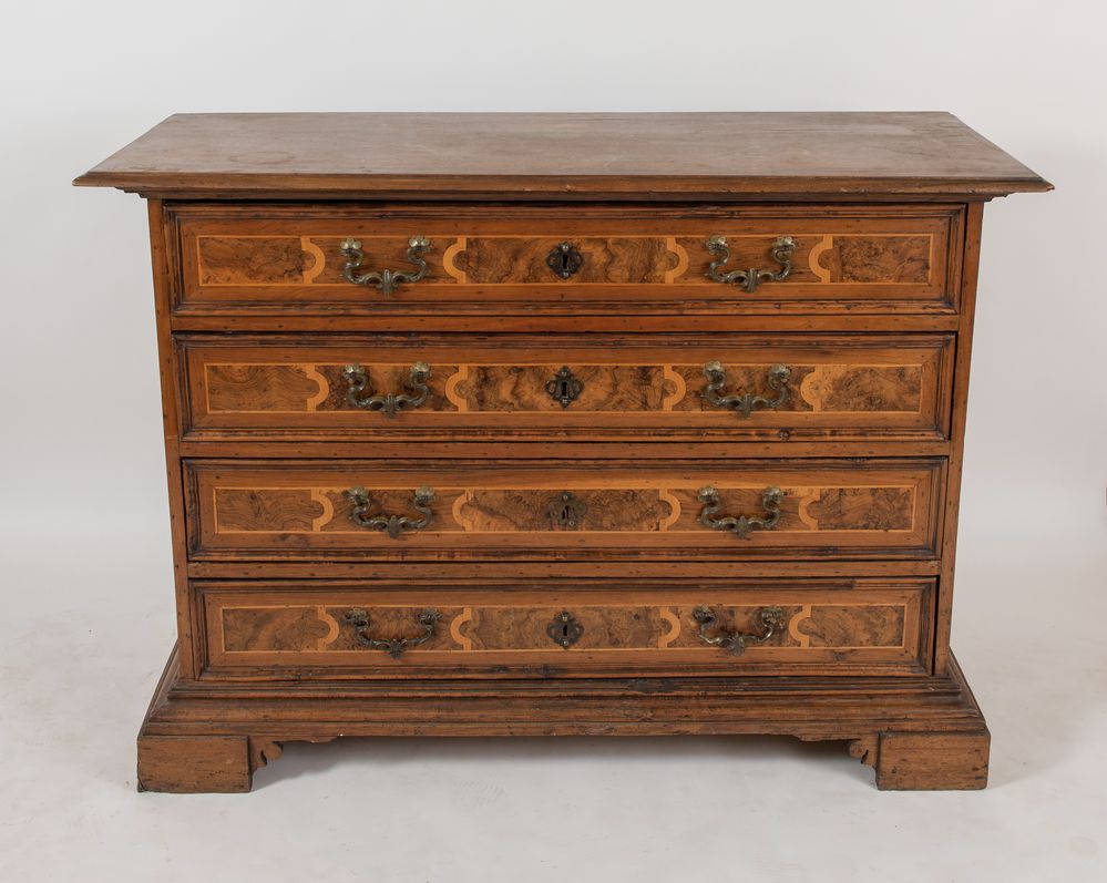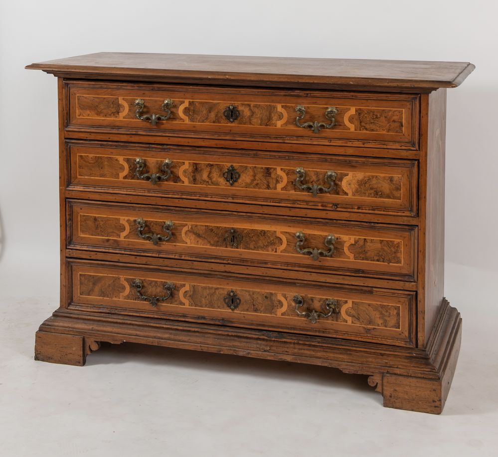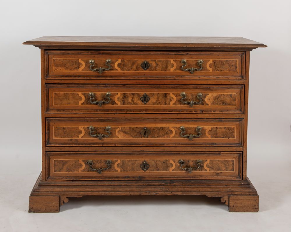 CANTERANO in massello di noce con cassetti lastronati di radica di noce con filettature in acero. Cornicione modanato alla base e sostegni a mensola. Bologna, XVII secolo. Cm 109x155x63.