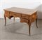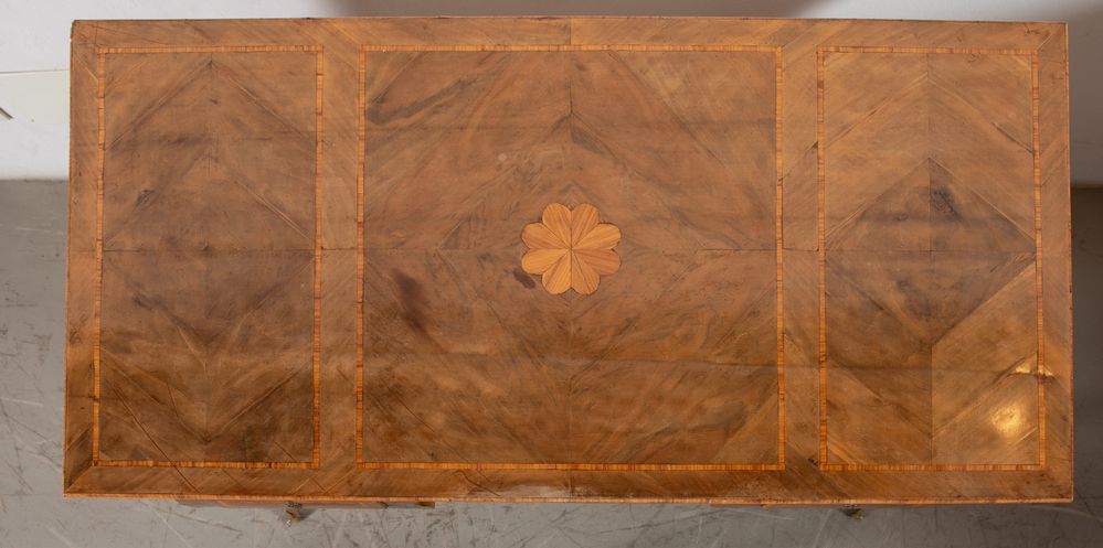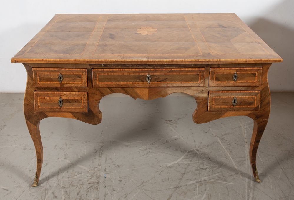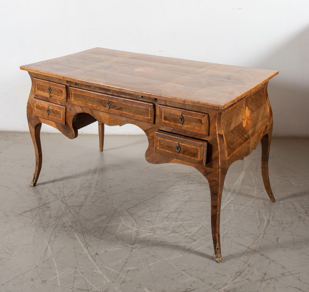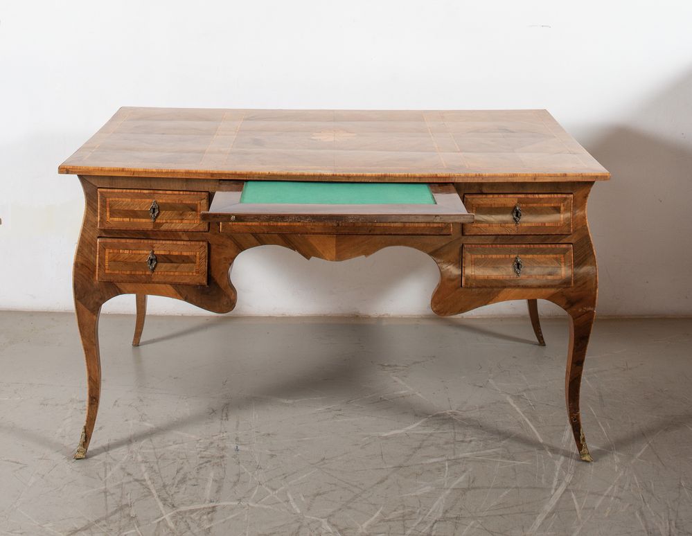 TAVOLO SCRIVANIA. Realizzato ad imitazione di una scrivania napoletana di metà XVIII secolo. Lastronata in noce con intarsi in palissandro e bois de rose. Cm 82x148x77.