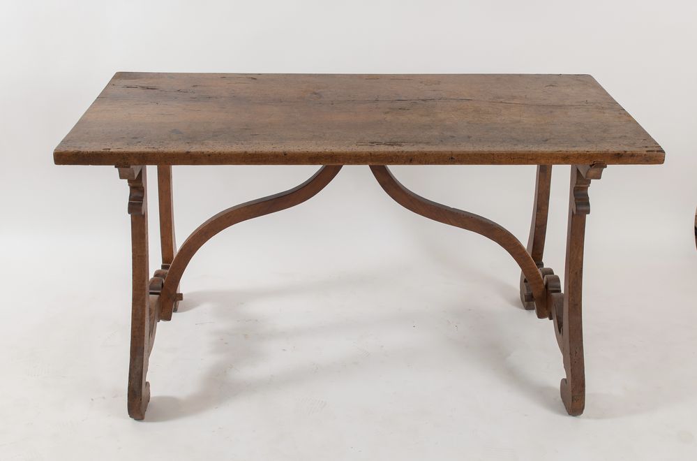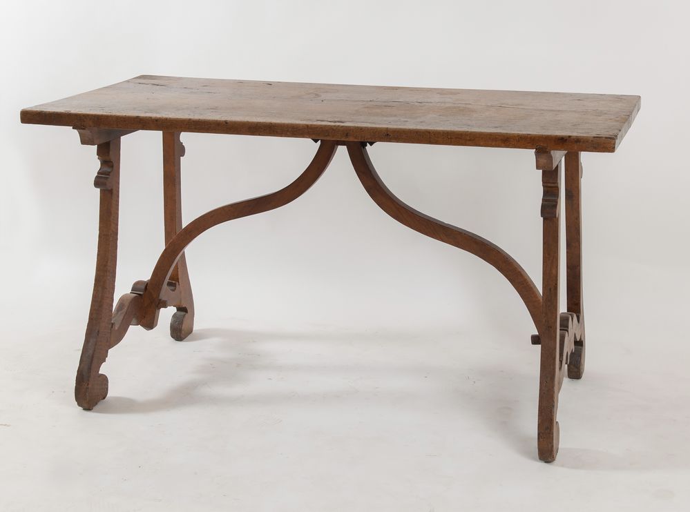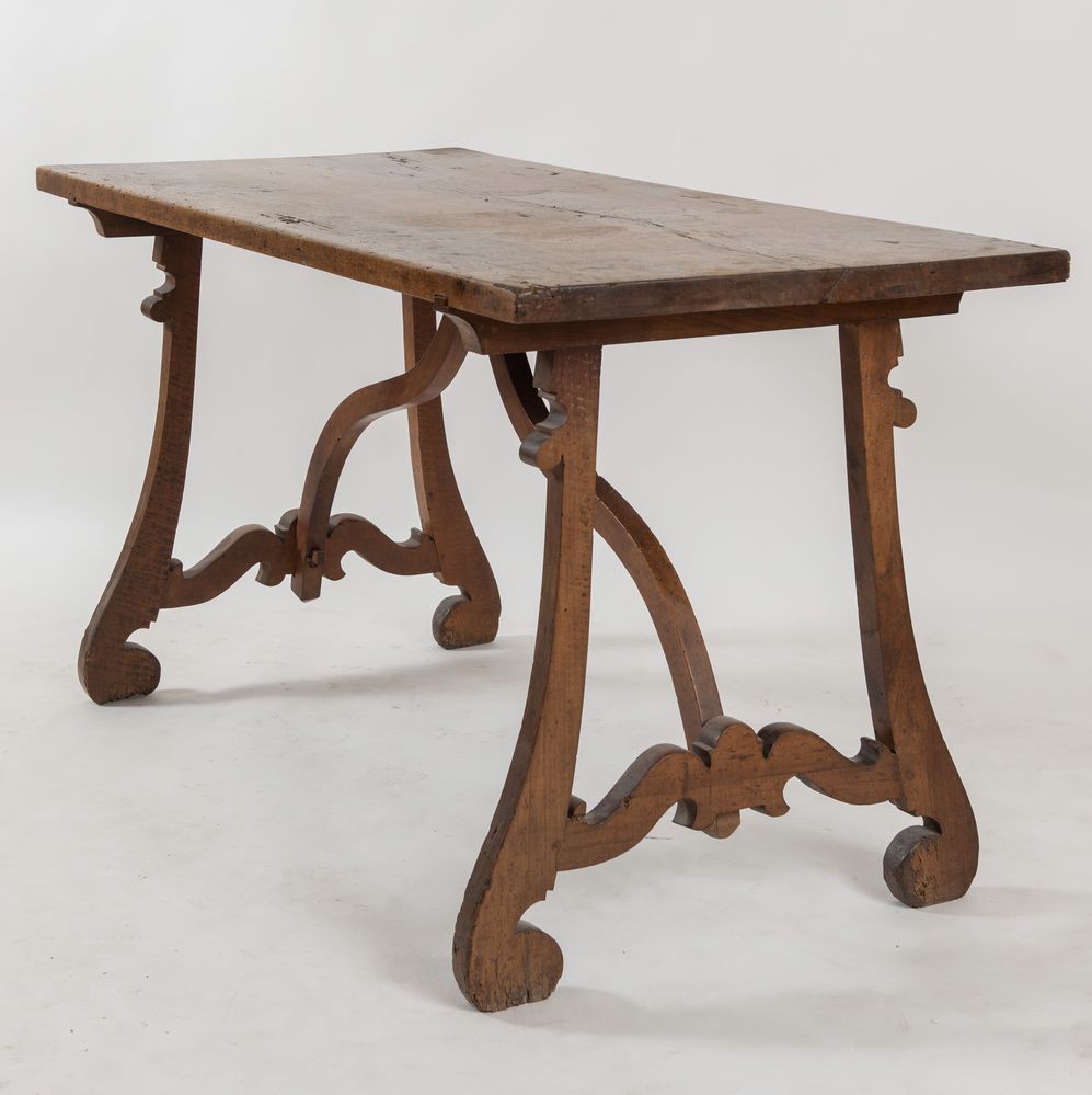 TAVOLO FRATTINO con sostegni mistilinei. Realizzato in massello di noce. Emilia, XVII secolo. Cm 78x145,5x70.