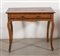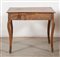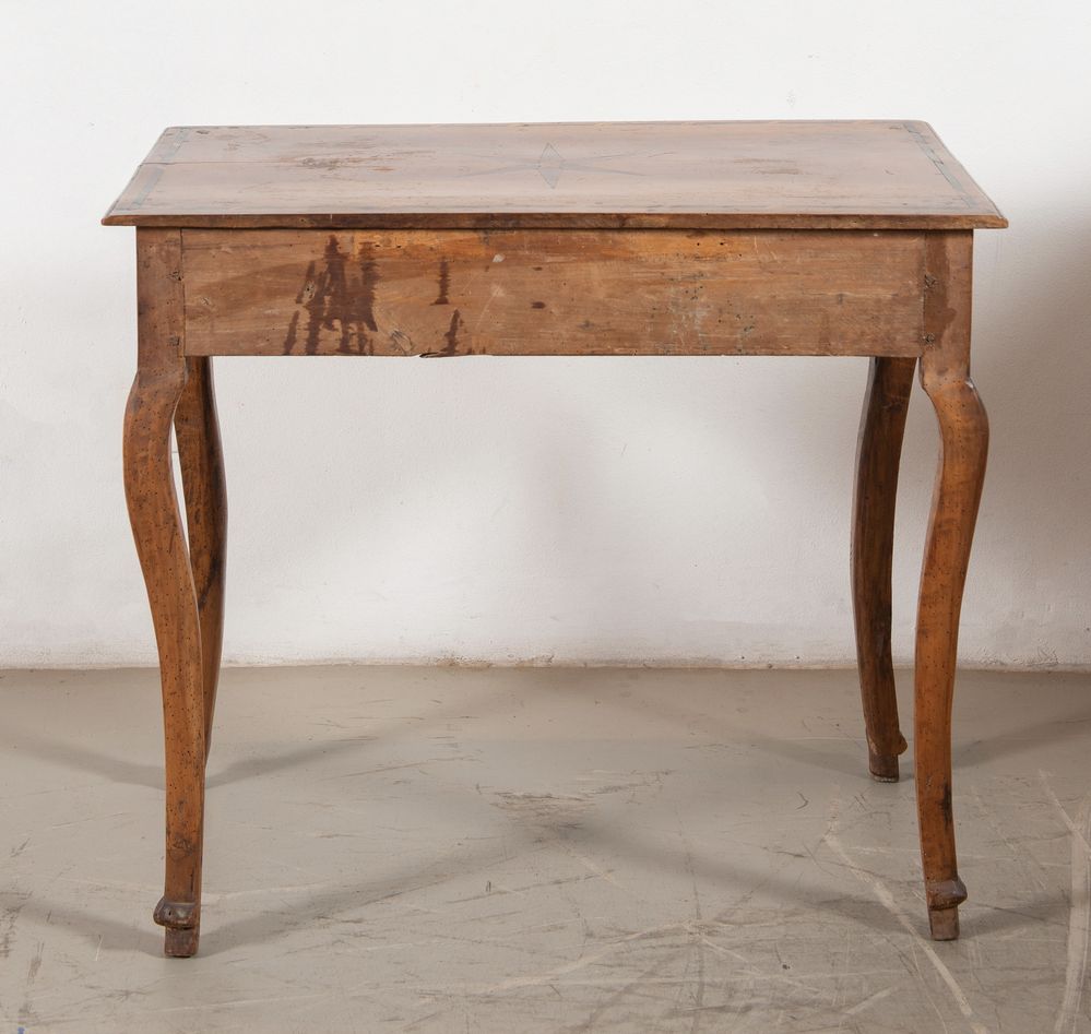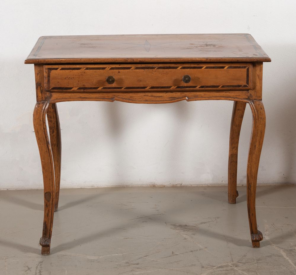 TAVOLINO in massello di noce, con filettatura in carrubo. Sostegni di forma leggermente ricurva. Piemonte, metà del XVIII secolo. Cm 73,5x85,5x45.