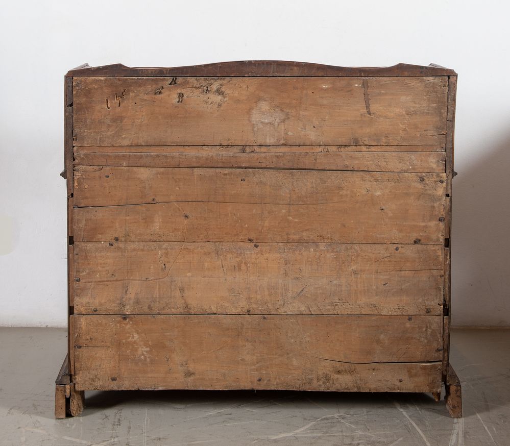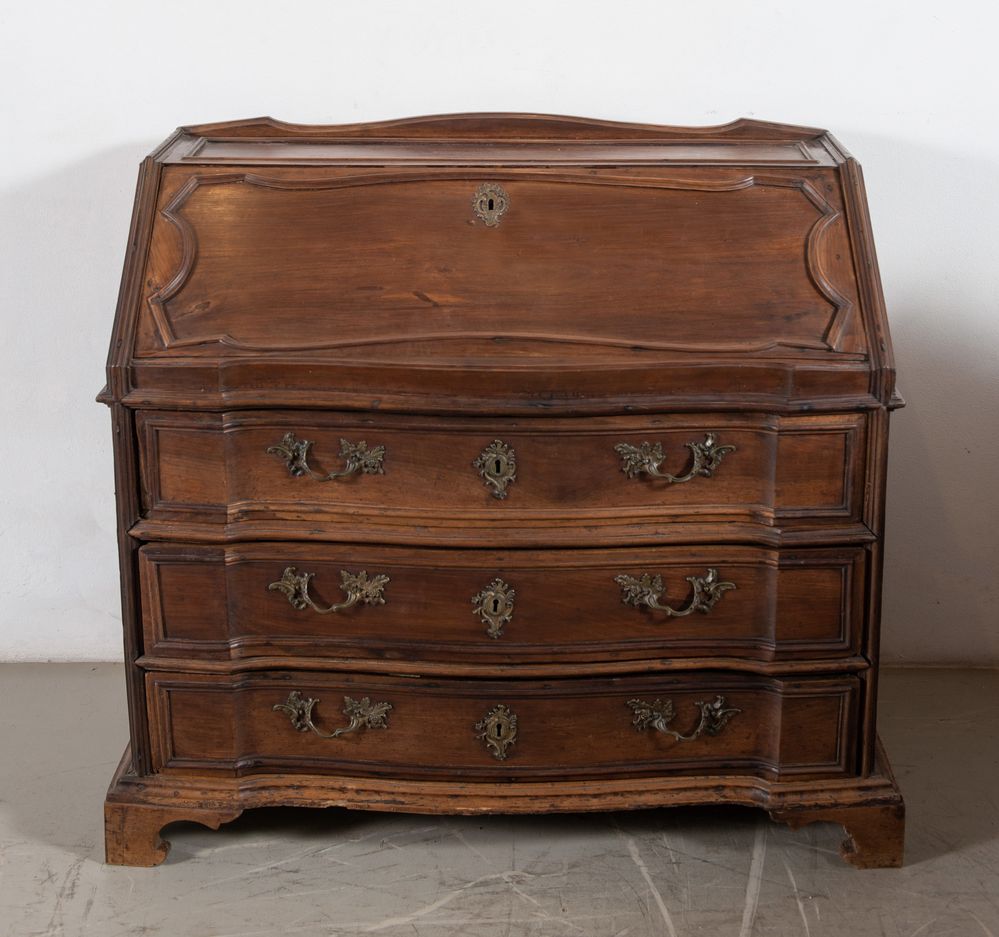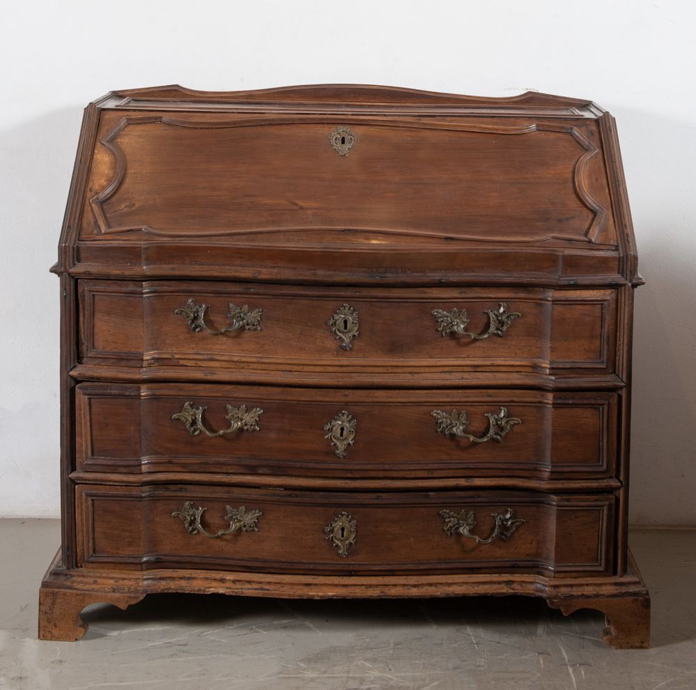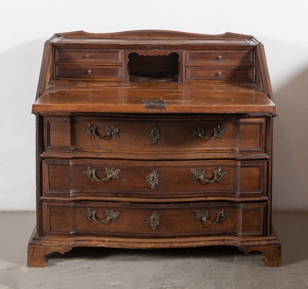 RIBALTA in massello di noce, con fronte mosso sotteso da cornicione modanato con piedi a mensola. La calatoia cela uno scarabattolo recante quattro cassetti e una nicchia a giorno. Presenta ferramenta e maniglie originali. Lombardia, prima metà del XVIII secolo.