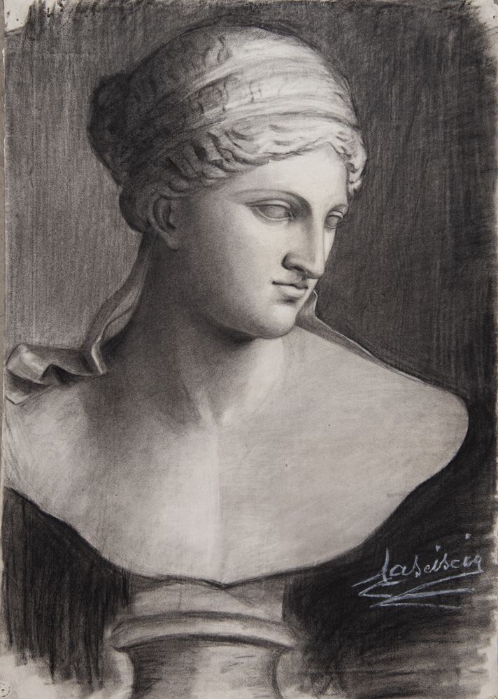 Pittore anonimo del XX secolo "Copia dal vero di un busto all'antica". Disegno su carta. Cm 60x42,5. Opera firmata in basso a destra.