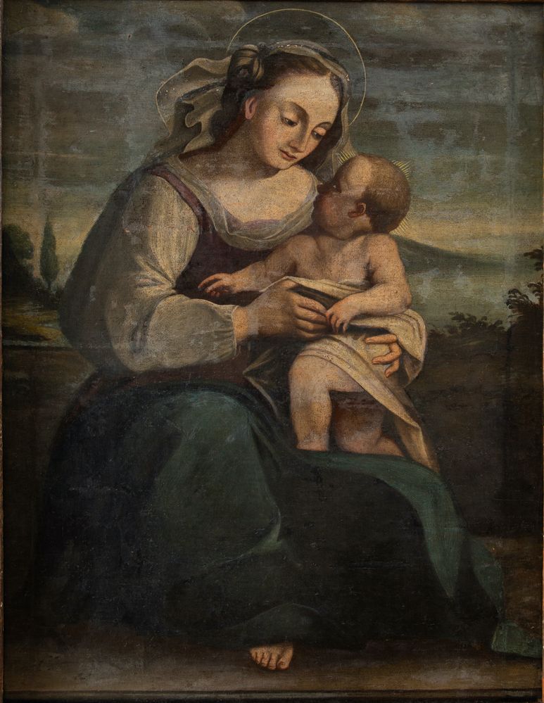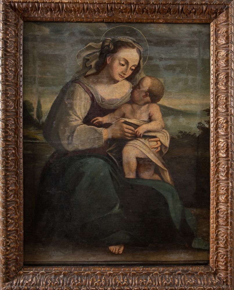 Maestro del XVII secolo “Madonna con bambino”. Olio su tela applicata su...
