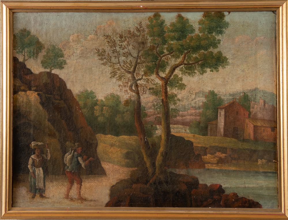 Maestro del XVII secolo “Paesaggio con figure”. Olio su tela. Cadauno di cm 39x53.