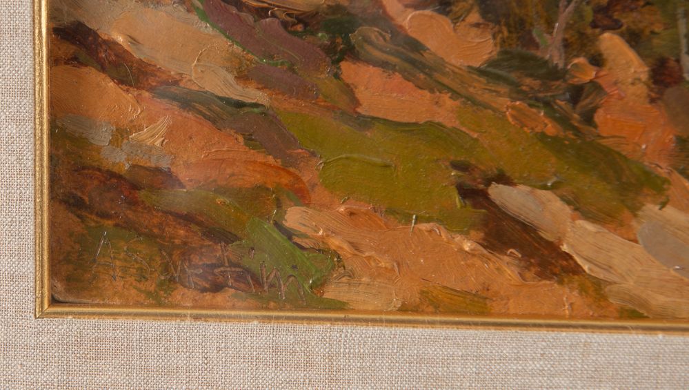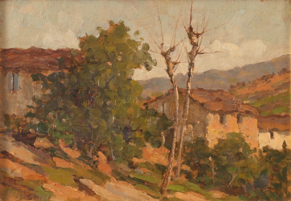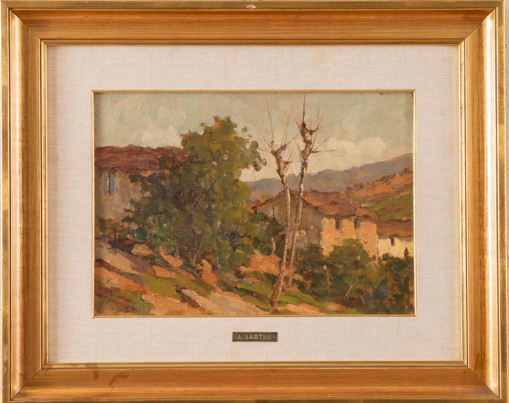 ANTONIO SARTINI (Crespellano 1889 - Bazzano 1954) "Paesaggio". Olio su tavola. Cm 25,5x36,5. Opera firmata in basso a sinistra A. Sartini.