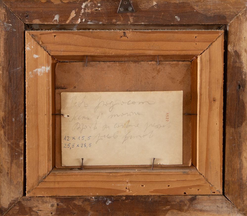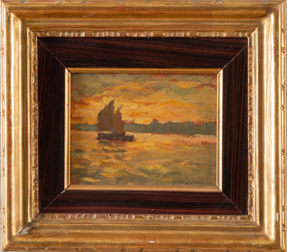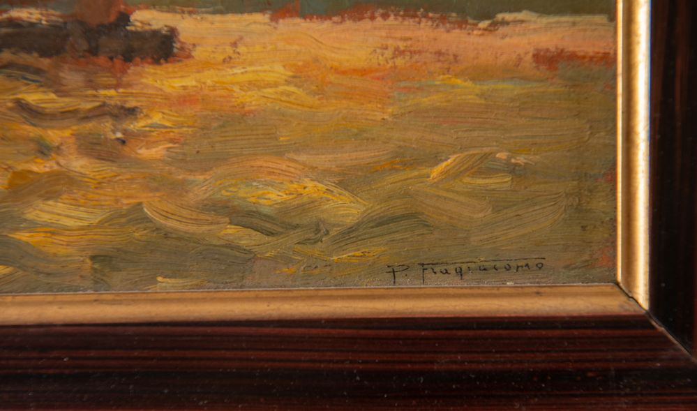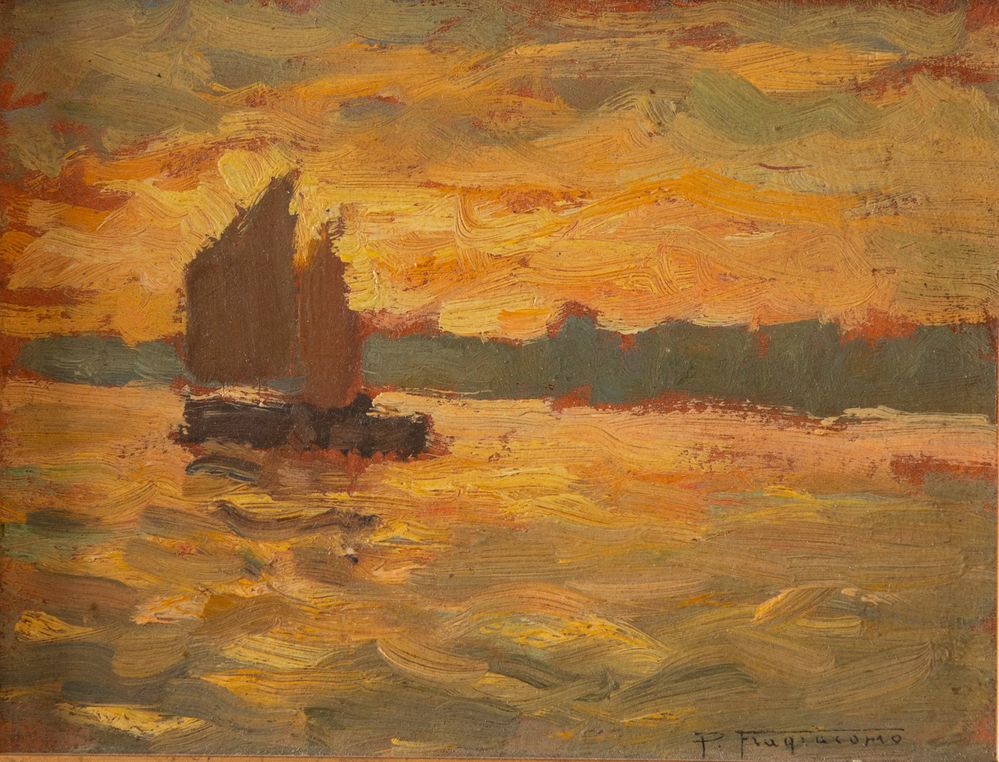 PIETRO FRAGIACOMO, attr. "Marina con barche". Olio su tavola. Cm 12x15,5. Opera firmata in basso a destra Fragiacomo.