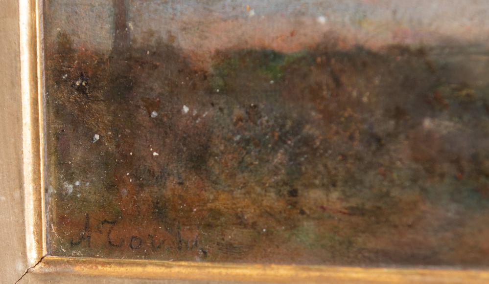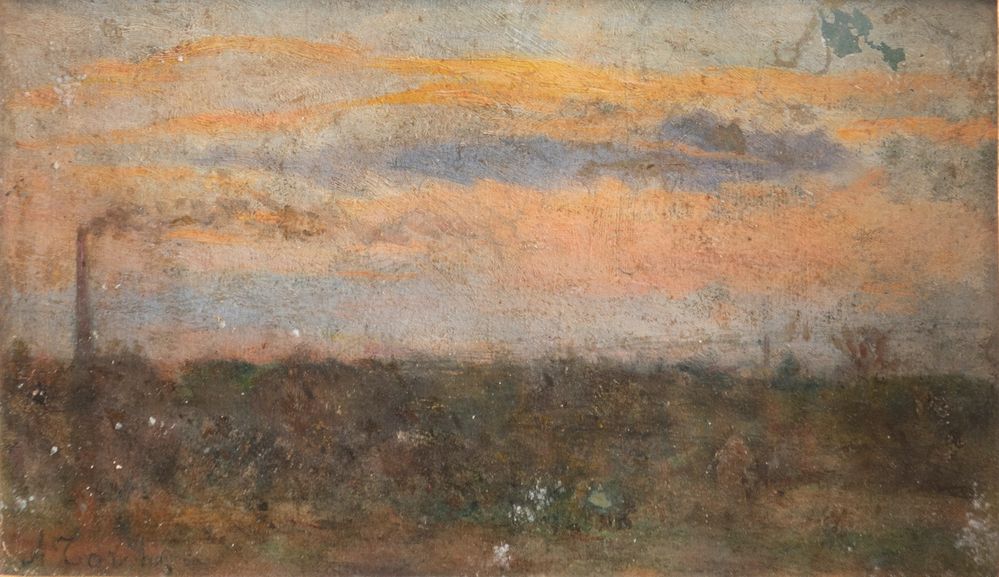 ANGELO TORCHI (Massa Lombarda 1856 - 1915) "Paesaggio". Olio su cartone. Cm 14,5x24. Opera firmata in basso a sinistra A. Torchi.