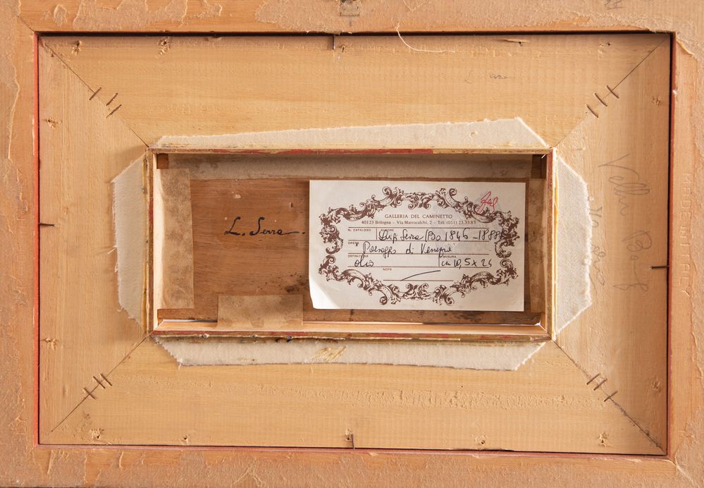 LUIGI SERRA (Bologna 1846 - 1888) "Paesaggio di Venezia". Olio su tavola. Cm 10,5x25. Opera firmata L. Serra al retro. Al retro reca etichetta della Galleria d'arte Il Caminetto, Bologna.