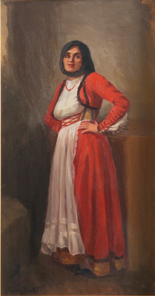 PAOLA SERRA ZANETTI(Budrio 1886 - 1963) "Ritratto femminile". Olio su tavola. Cm 45x24,5. Opera firmata in basso a sinistra P. Serra Zanetti.