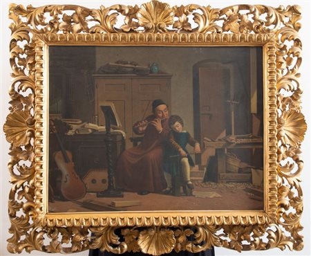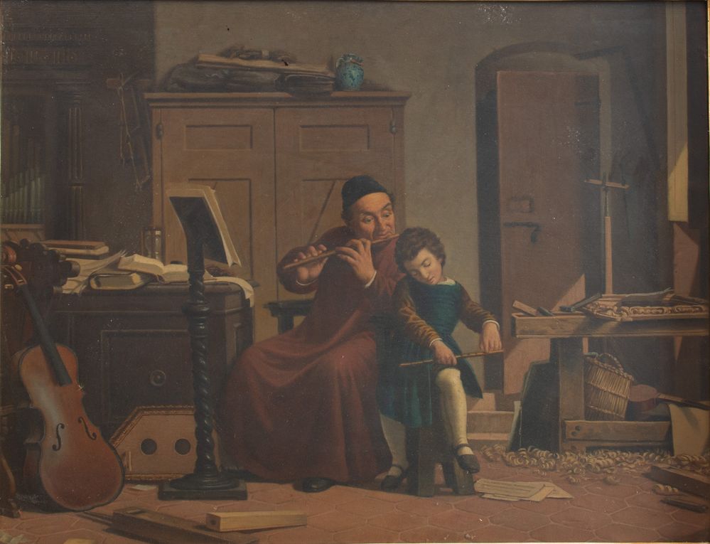 Maestro del XIX secolo. "Lezione di musica". Olio su tela. Cm 48,5x63.