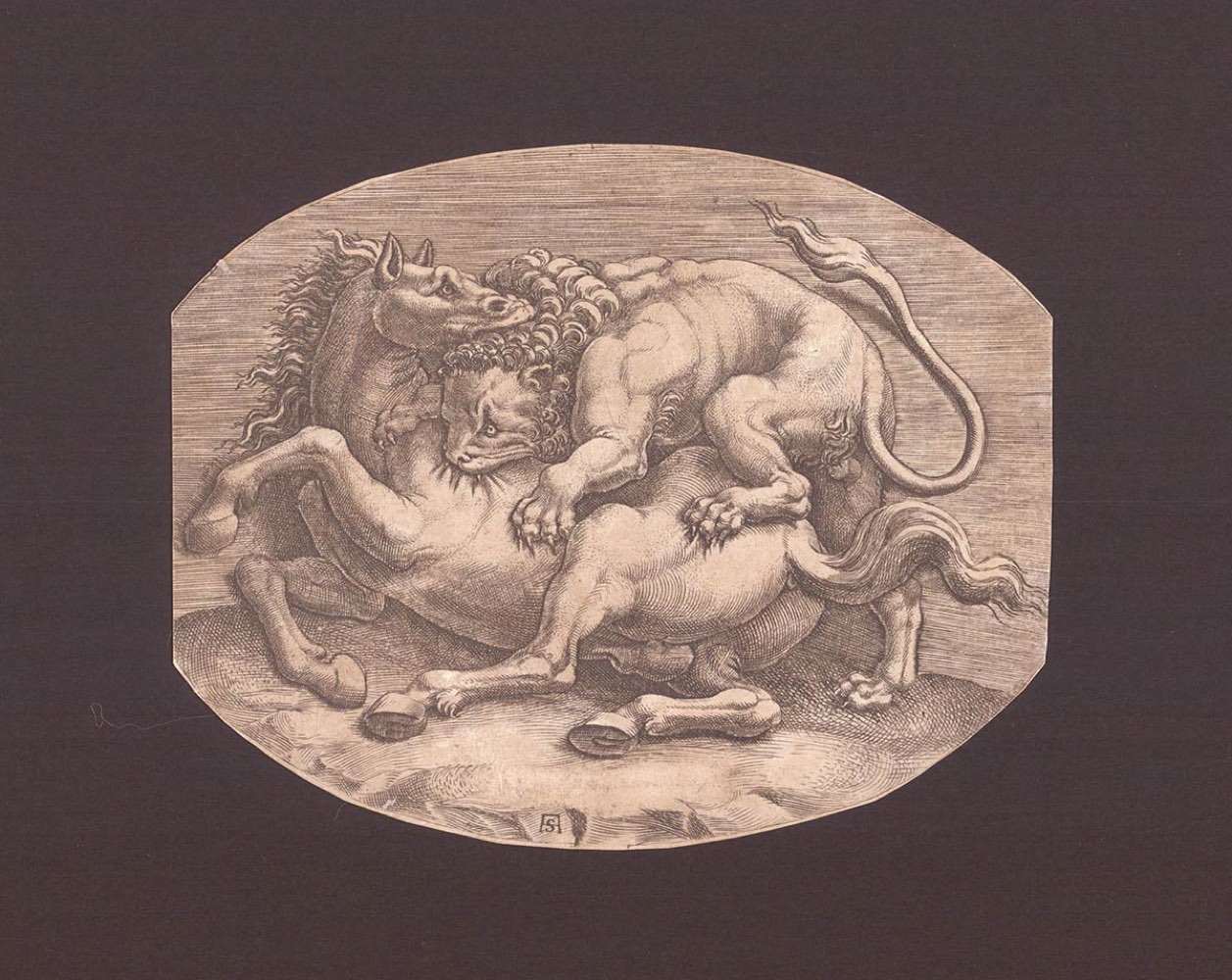 Adamo Scultori (1530-1585) : LEONE CHE ATTACCA UN CAVALLO