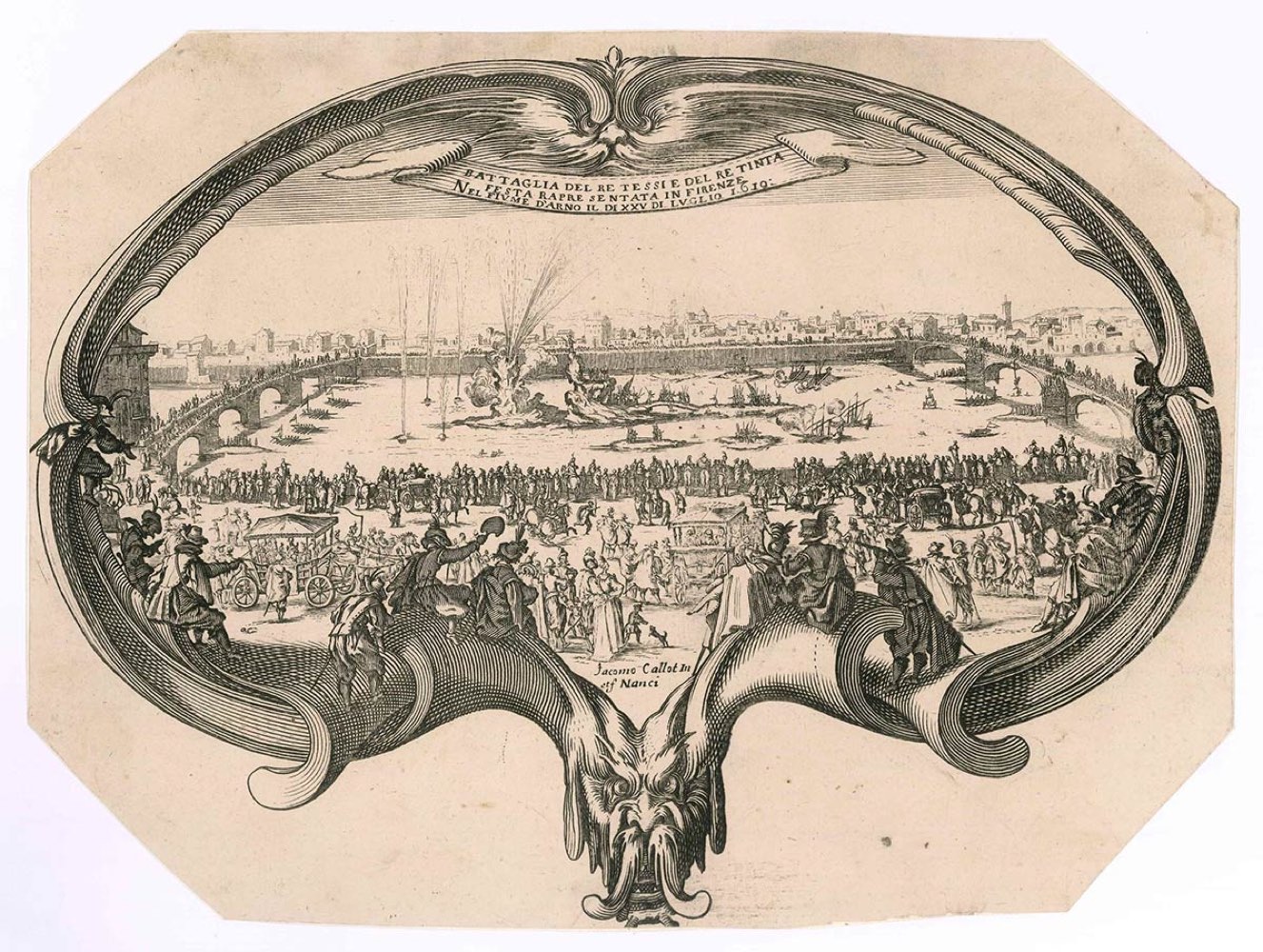 La veduta è inserita in un ventaglio cartiglio barocco e mostra la battaglia cerimoniale tra il re Weaver e il re Dyer sull'Arno nel 1619; in primo piano, la folla radunata in riva al fiume assiste alla cerimonia.