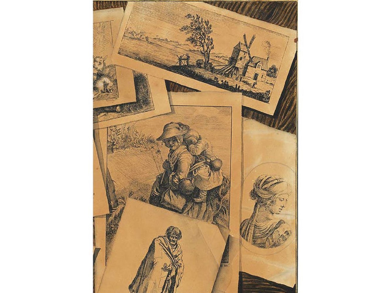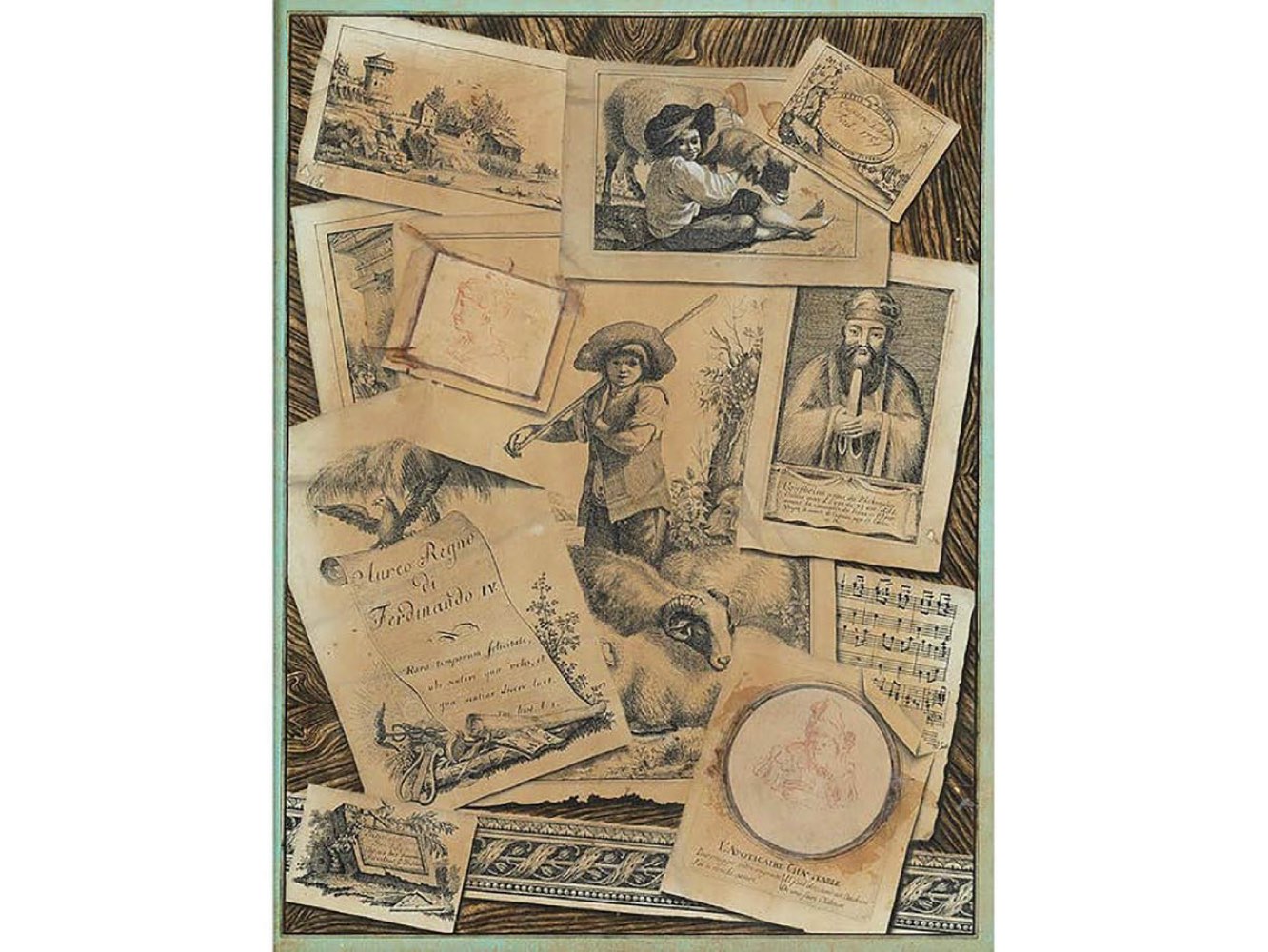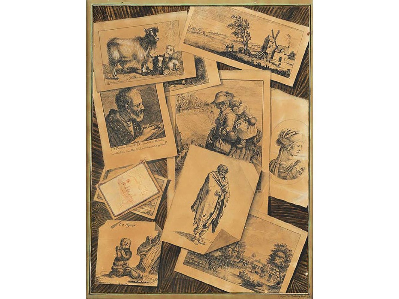 Coppia di dipinti in maniera trompe l'oeil raffiguranti le incisioni e disegni di grandi maestri del 1600 e 1700, tra cui Jacques Callot, Giovanni Battista Piazzetta e Claude René Gabriel Poulleau. Uno firmato e datato nell'angolo inferiore a destra: Caspar de Tschudy Fecit 1786. Un altro firmato su foglio in alto a destra: Gaspare Tschudy Fecit 1784.