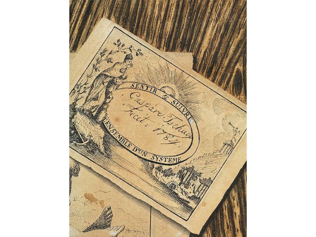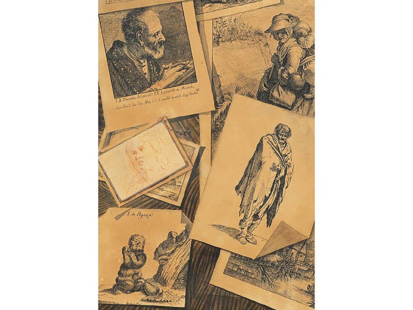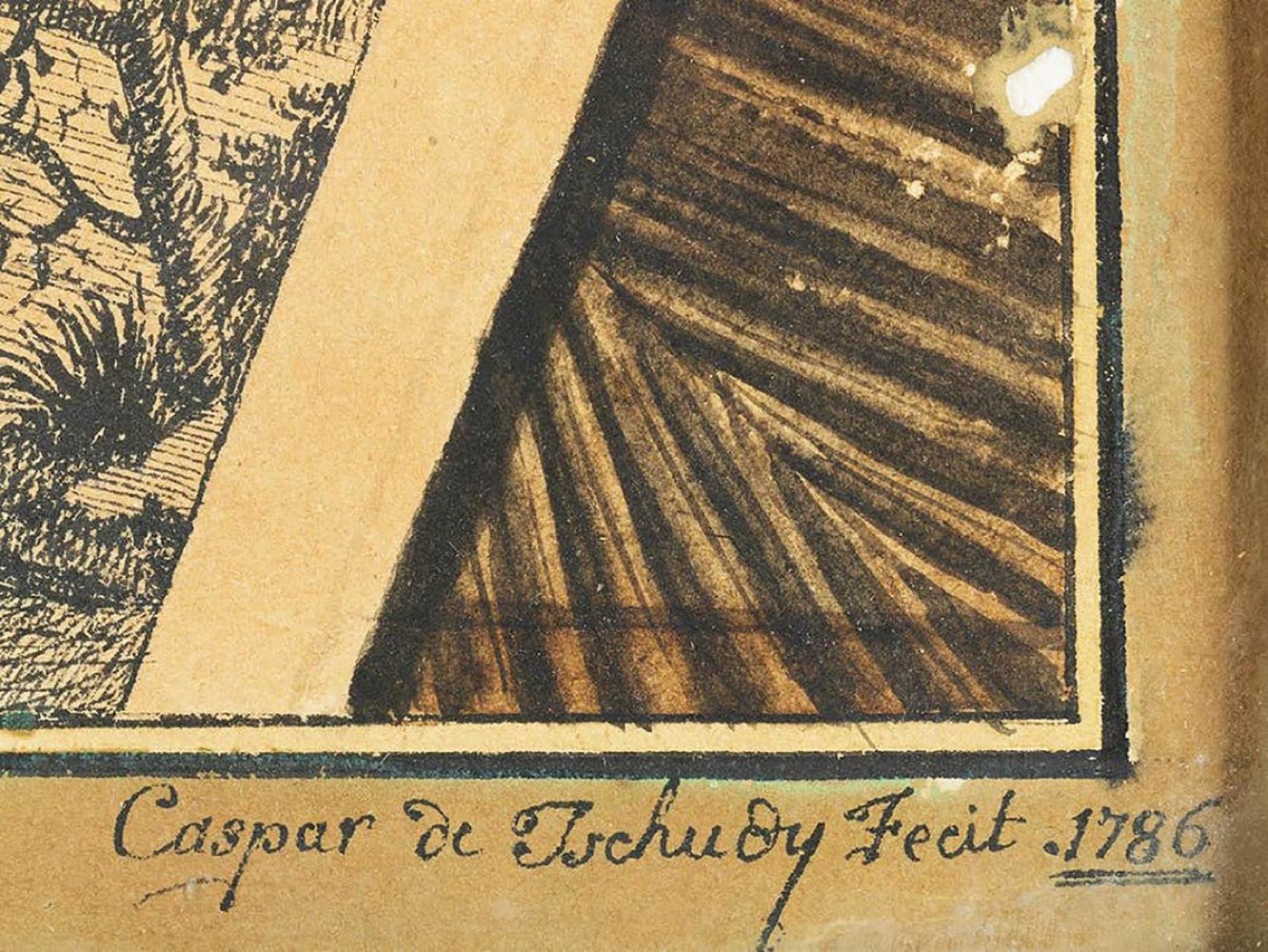Coppia di dipinti in maniera trompe l'oeil raffiguranti le incisioni e disegni di grandi maestri del 1600 e 1700, tra cui Jacques Callot, Giovanni Battista Piazzetta e Claude René Gabriel Poulleau. Uno firmato e datato nell'angolo inferiore a destra: Caspar de Tschudy Fecit 1786. Un altro firmato su foglio in alto a destra: Gaspare Tschudy Fecit 1784.