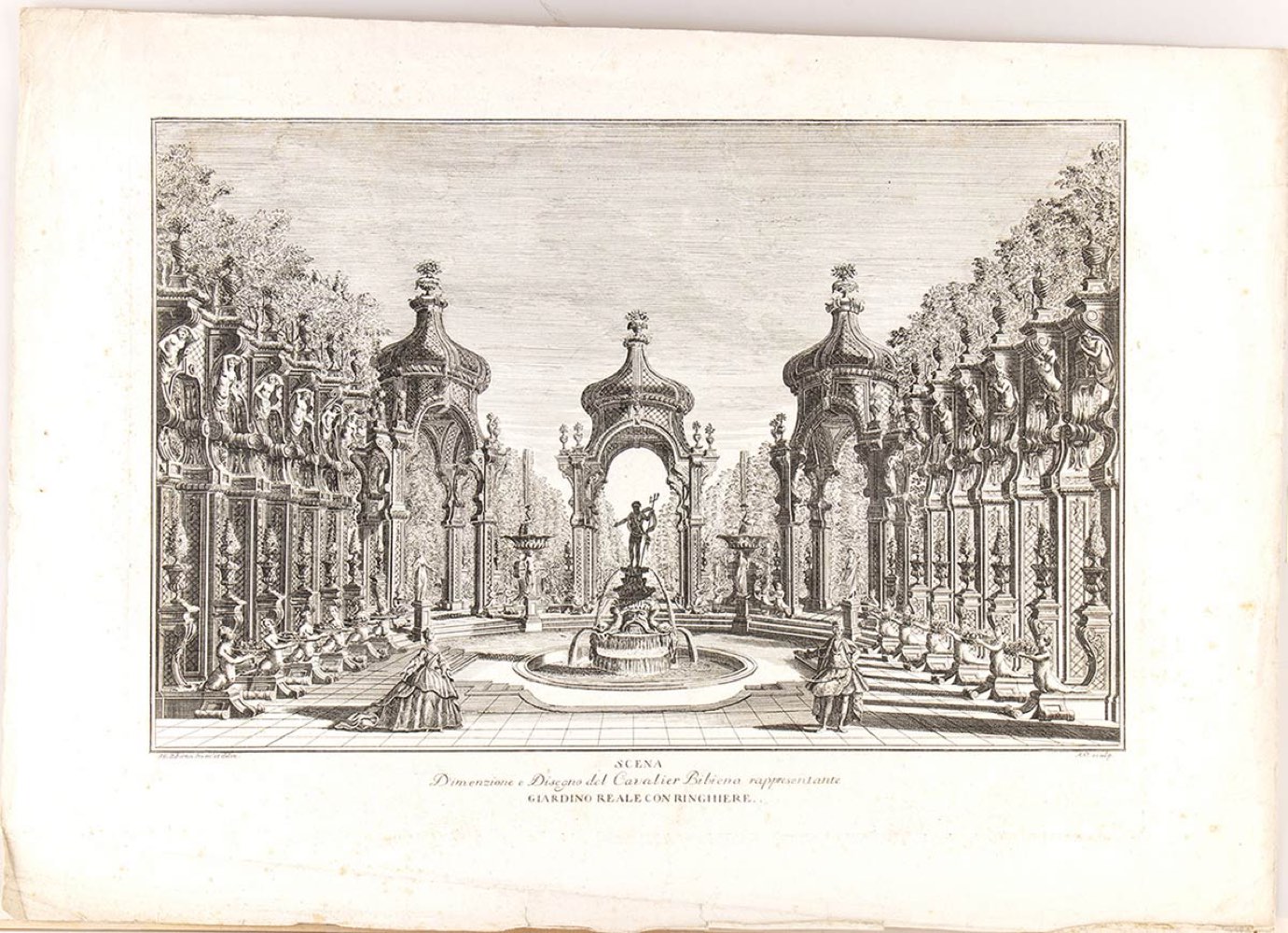 Orio Ambrogio (1737- 1825) da Giuseppe Galli da Bibiena (1696 – 1757) : SCENA D'INVENZIONE E DISEGNO DEL CAVALIER BIBIENA RAPPRESENTANTE GIARDINO REALE CON RINGHIERE