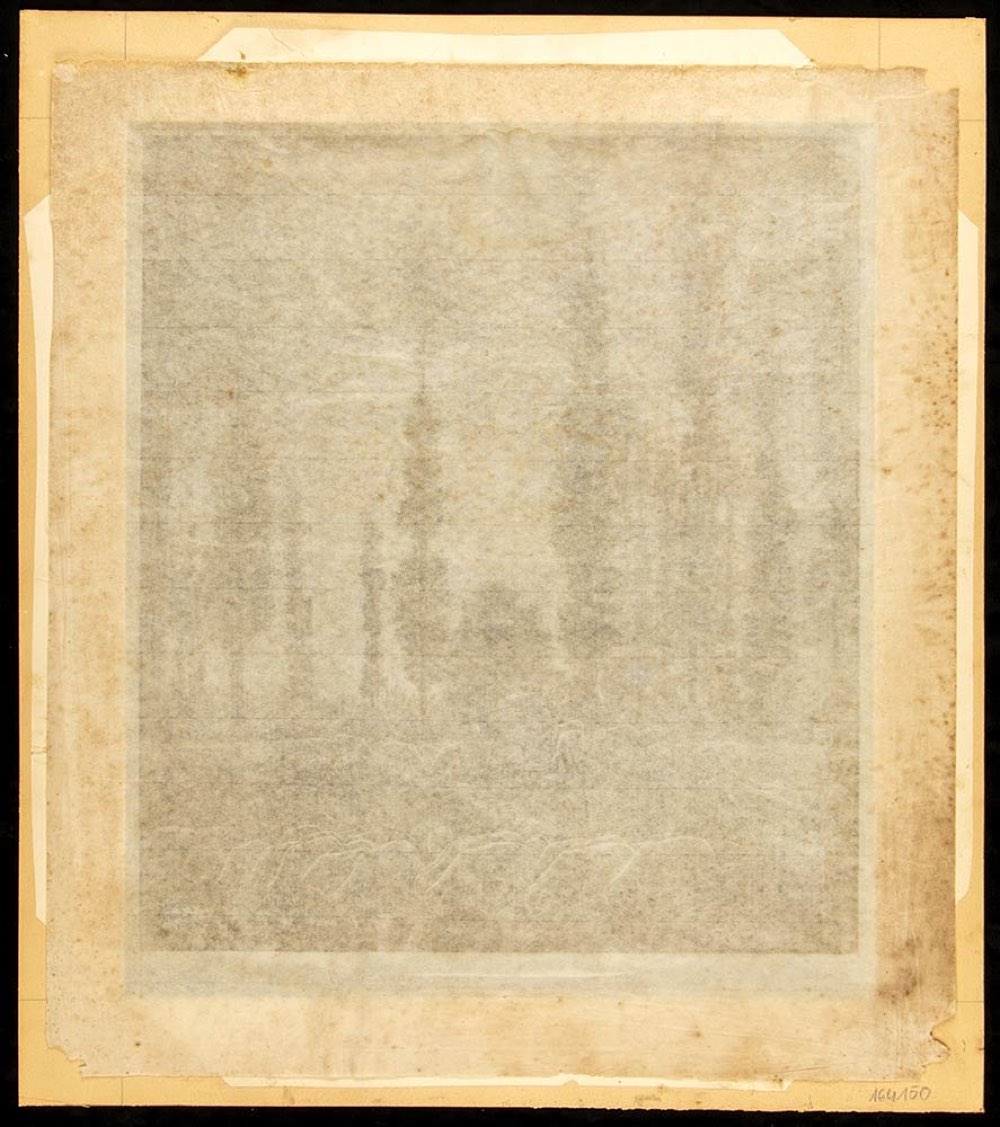Increspatura e pieghe della carta. Difetti nei tre angoli (strappi). Applicato in due punti in alto a passpartout. Una piccola spellatura al verso in corrispondenza di uno dei punti. Fioritura sparsa. Ingiallimento da esposizione. Qualche macchia d'umidita.
