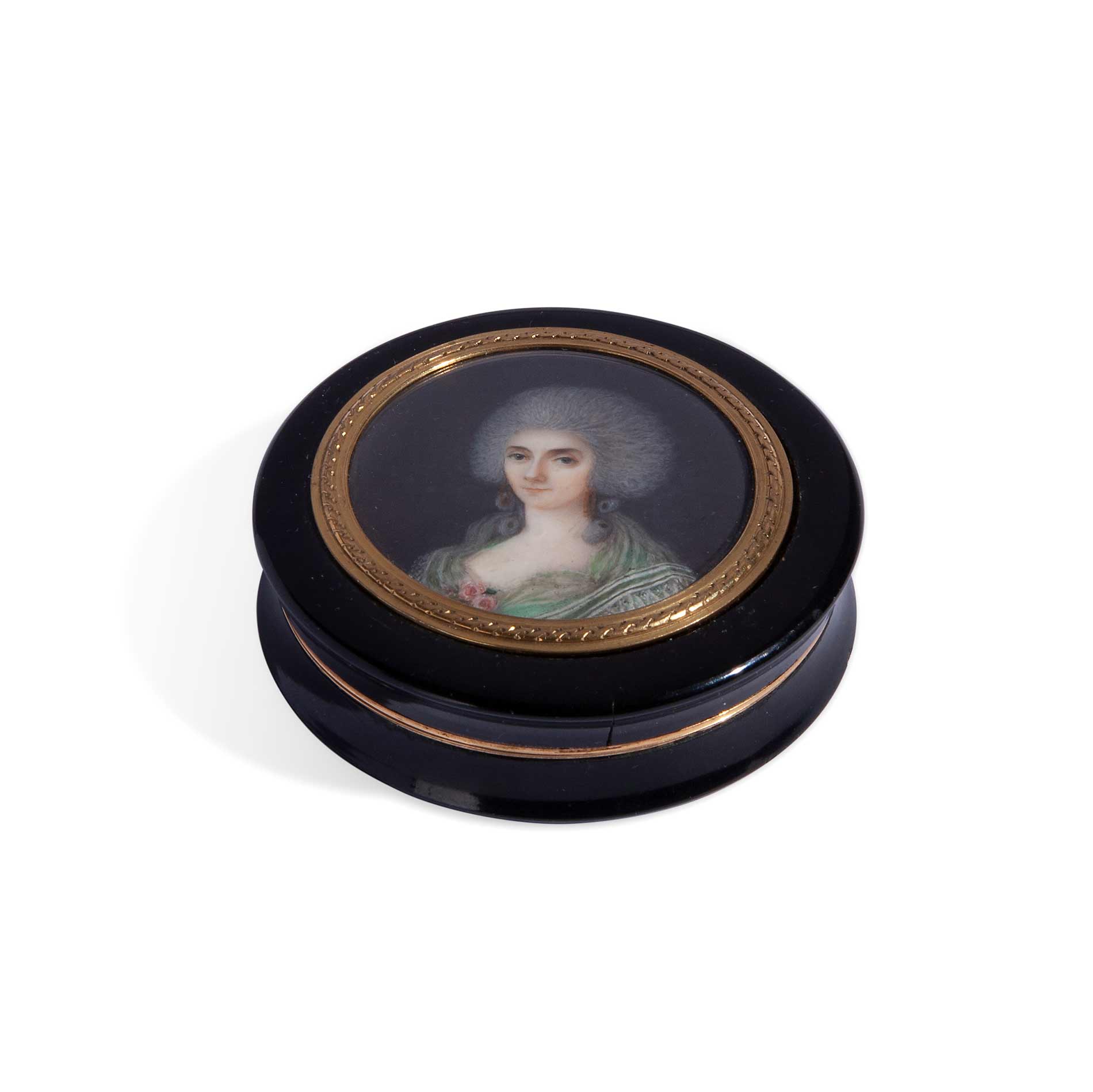 Scatola tonda con miniatura dipinta su avorio, primo quarto XIX secolo Manifattura inglese, miniatura con inserti in oro con cornice raffigurante una gentildonna; oro 18 kti Diametro cm. 7,4