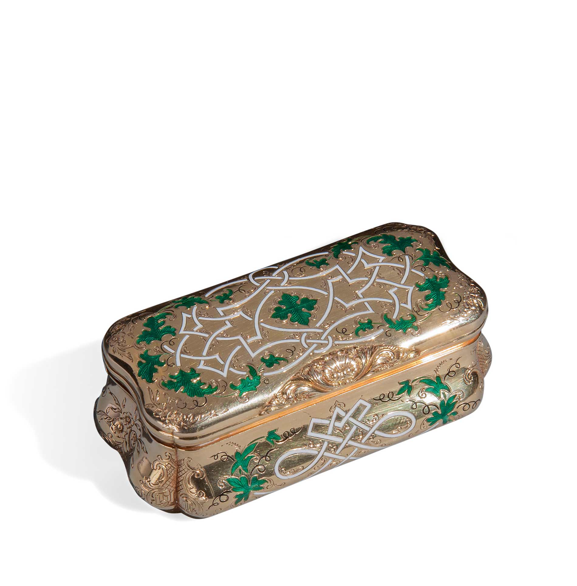 Scatola in oro e smalti, metà XIX secolo Manifattura mitteleuropea, decorazioni in smalto verde e bianco a motivi vegetali e geometrici, oro 14 kti; peso complessivo gr. 92,3 Larghezza cm. 8,2