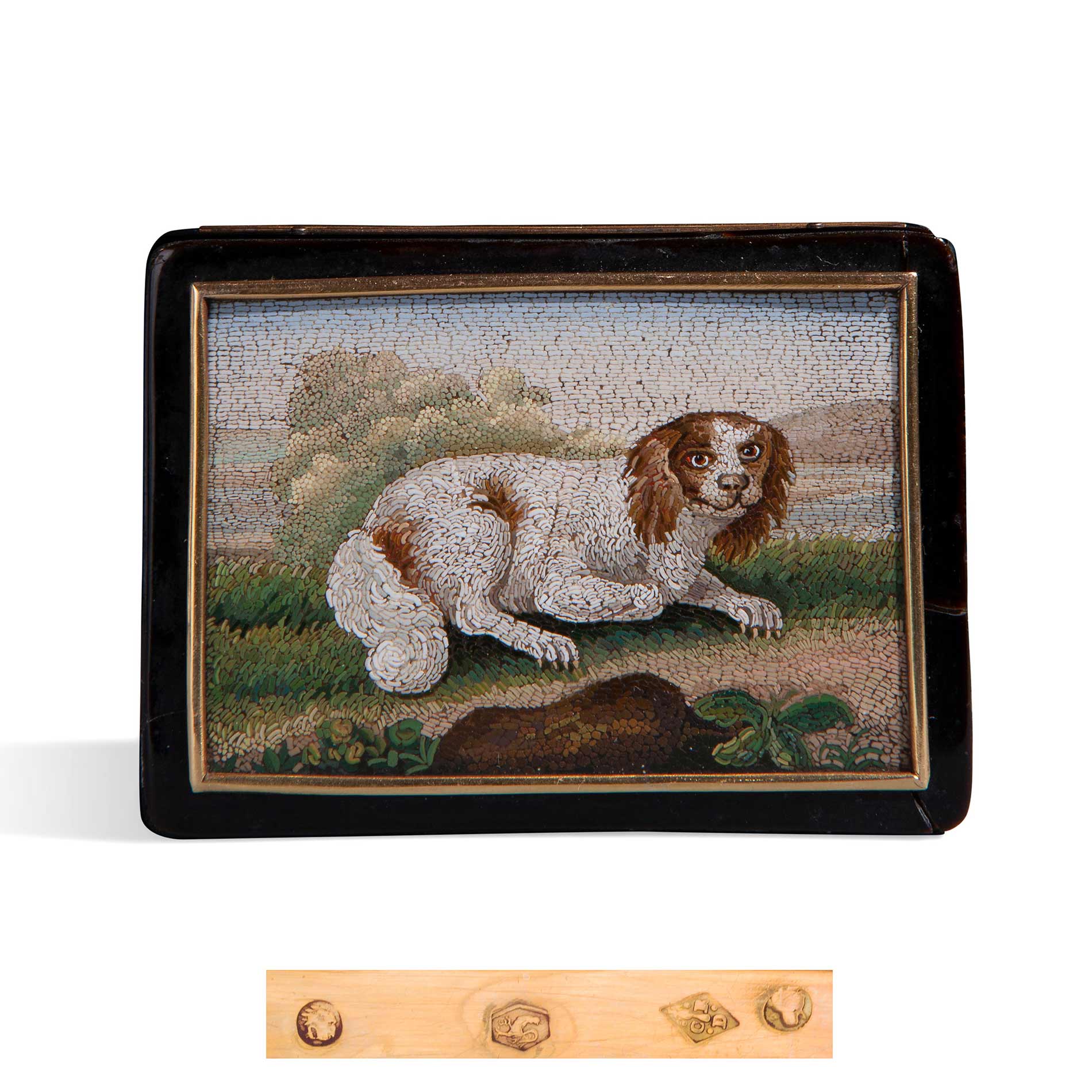 Scatola rettangolare in tartaruga, oro e micromosaico, XVIII secolo Manifattura della RFSP, oro 18 kti Larghezza cm. 8