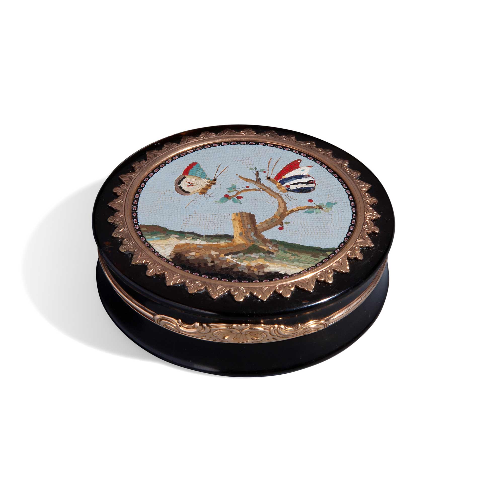Scatola tonda in tartaruga e oro, XVIII secolo Manifattura della RFSP, del maestro Giacomo Raffaelli, oro 18 kti Diametro cm. 8,3