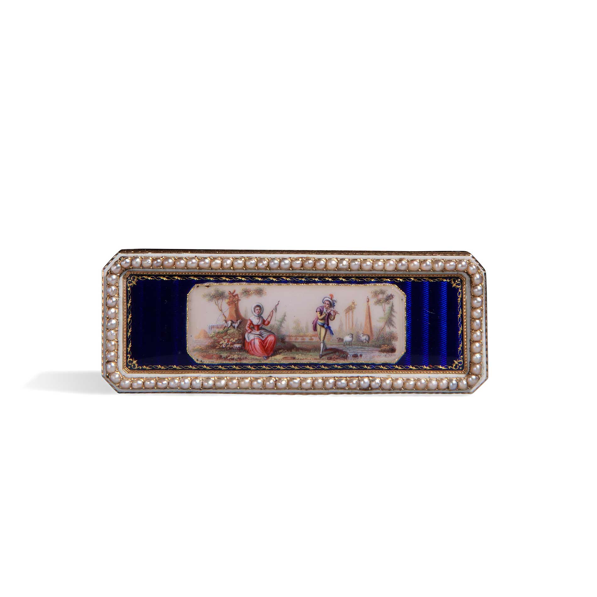 Scatola in oro, perle e smalti, XVIII secolo Manifattura francese, fondo blu dello smalto a guilloché. Miniatura raffigurante scena campestre, oro 18 kti; peso complessivo gr. 109,1 Larghezza cm. 8,6