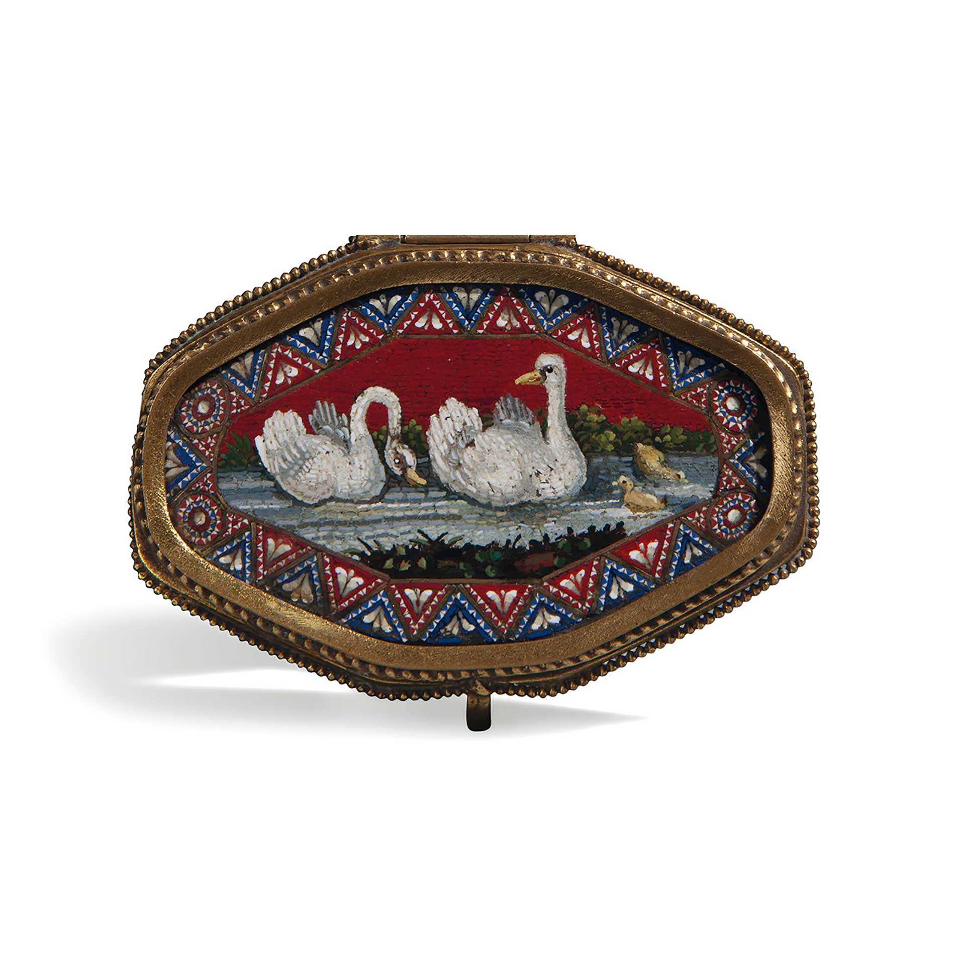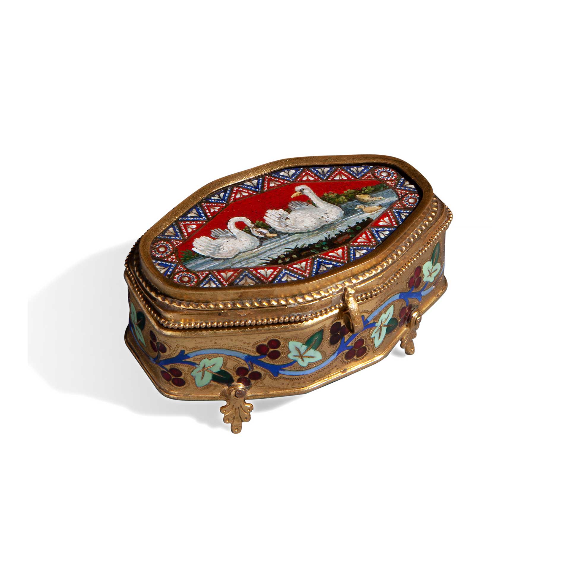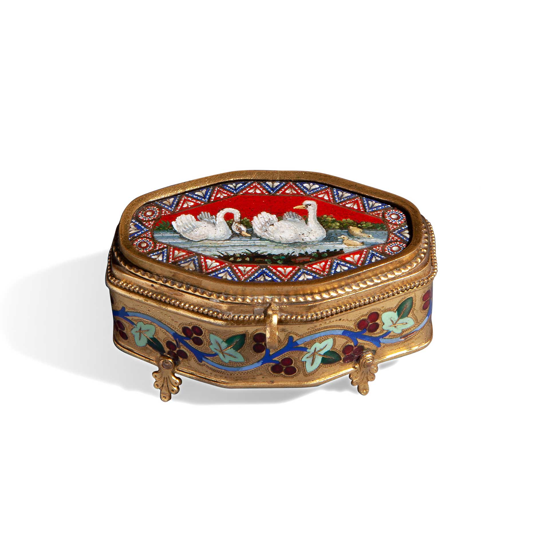 Lot 140 | Scatola in metallo dorato, micromosaico e smalti, XIX secolo