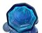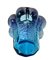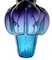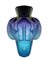 Collo di forma esagonale lievemente estroflessa corpo di forma globulare irregolare base esagonale in vetro ghiacciato, colorazione a sfumare dai toni del nero all’azzurro, etichetta della manifattura in alto con firma Veart.