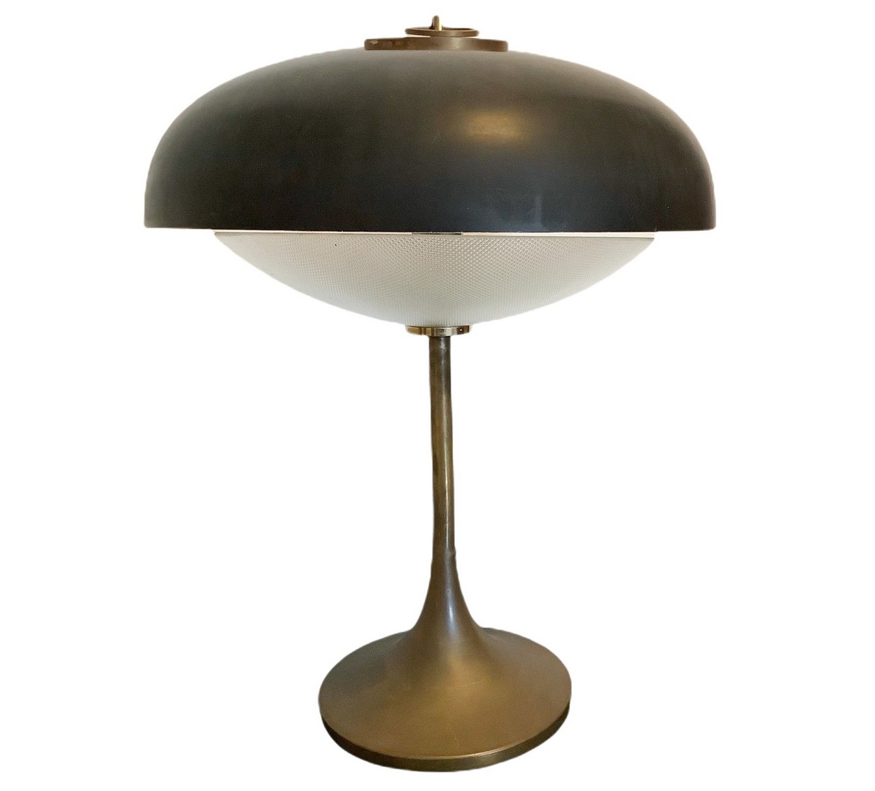Gregoretti Stoppino Meneghetto per Arredoluce - Rarissima lampada da tavolo con struttura in fusione di ottone, 1950s 34x30 cm Diffusore in alluminio laccato esternamente nei toni del nero opaco internamente nei toni del bianco, controdiffusore in vetro stampato. Segni di uso.