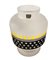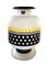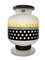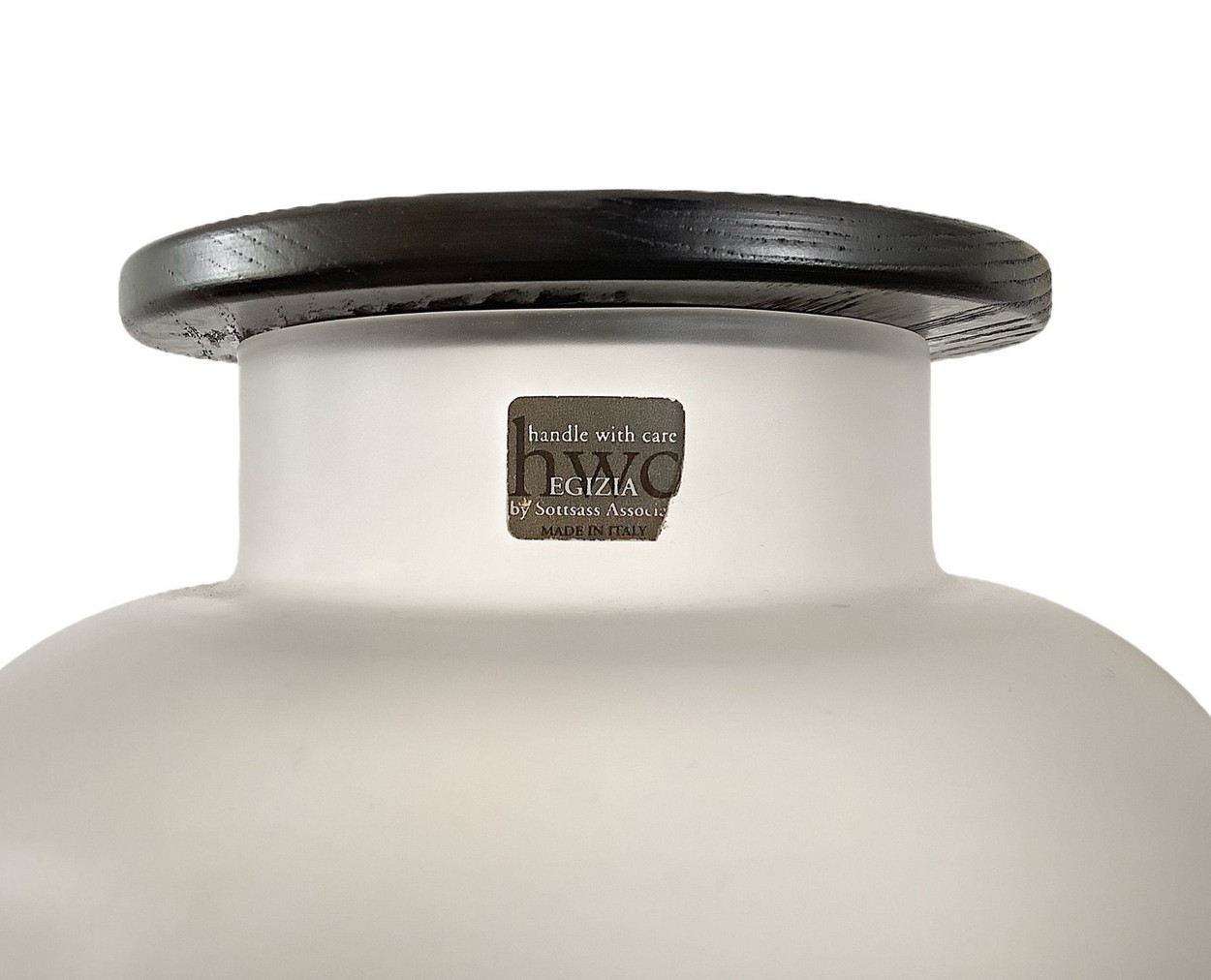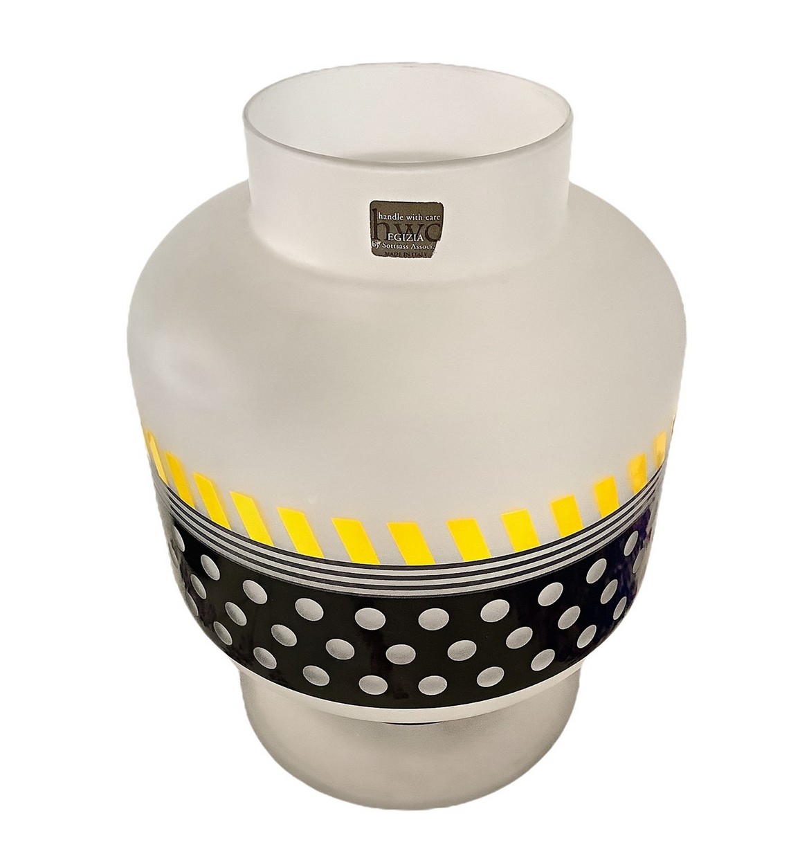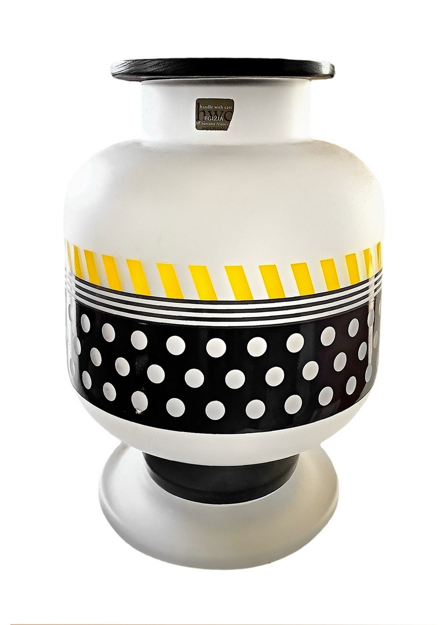 Ettore Sottsass per Egizia - Mod. Bonnie, vaso in vetro trasparente satinato, corpo globulare., 90's. Cm 28x20 diam Base circolare e alto collo con coperchio in legno, superficie riportante decori geometrici neI toni del giallo e del nero. Etichetta della manifattura. Base circolare e alto collo con coperchio in legno, superficie riportante decori geometrici neI toni del giallo e del nero. Etichetta della manifattura.
