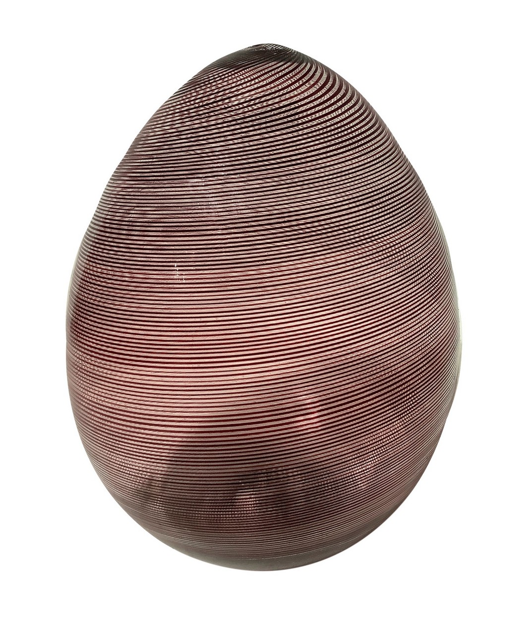 Venini - Disegno Paolo Venini, Uovo in vetro trasparente con decoro a mezza filigrana nei toni dell'amaranto, firmao a punta di diamante. Firma incisa alla baseFirma incisa alla base