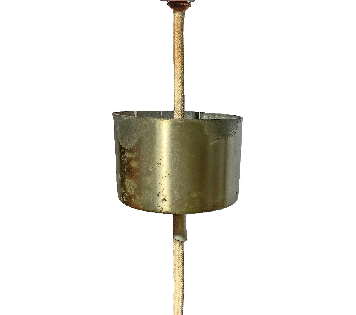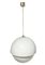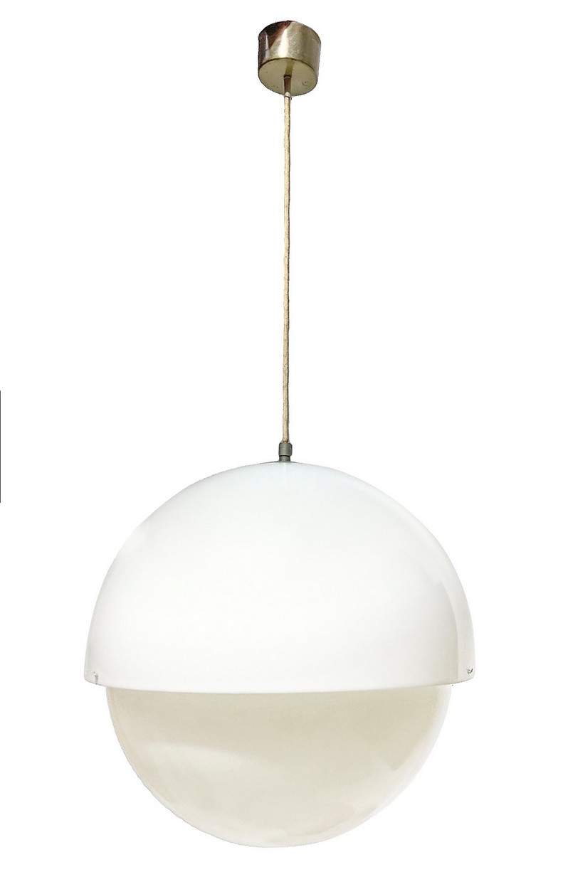 Lampadario con struttura in perspex opalino bianco e dettagli in ottone nichelato. 37x25 cm Produzione italiana nello stile di Vico Magistretti, Segni d'uso.Produzione italiana nello stile di Vico Magistretti, Segni d'uso.