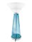 Struttura in metallo cromato, corpo in vetro trasparente di forma tronco-conica nei toni dell’azzurro, diffusore in vetro bianco incamiciato, controdiffusore in vetro satinato