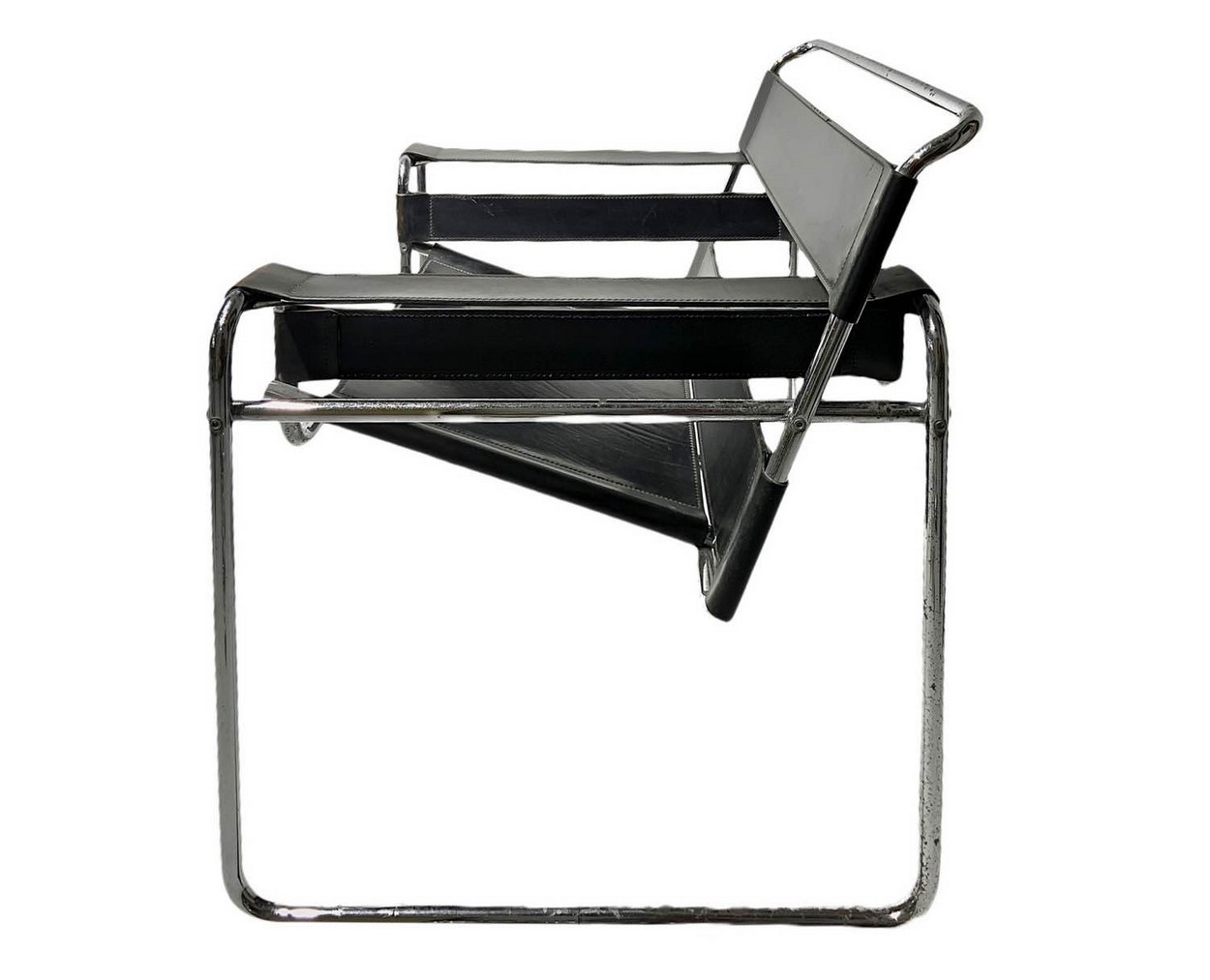 Gavina (1960) - poltrona disegno Marcel Breuer, modello Vassily, 1980s H cm 75, cm 76x70 con struttura in metallo tubolare cromato, seduta e spalliera a fasce di cuoio di forte spessore nei toni del nero. Salti di cromaturecon struttura in metallo tubolare cromato, seduta e spalliera a fasce di cuoio di forte spessore nei toni del nero. Salti di cromature
