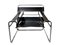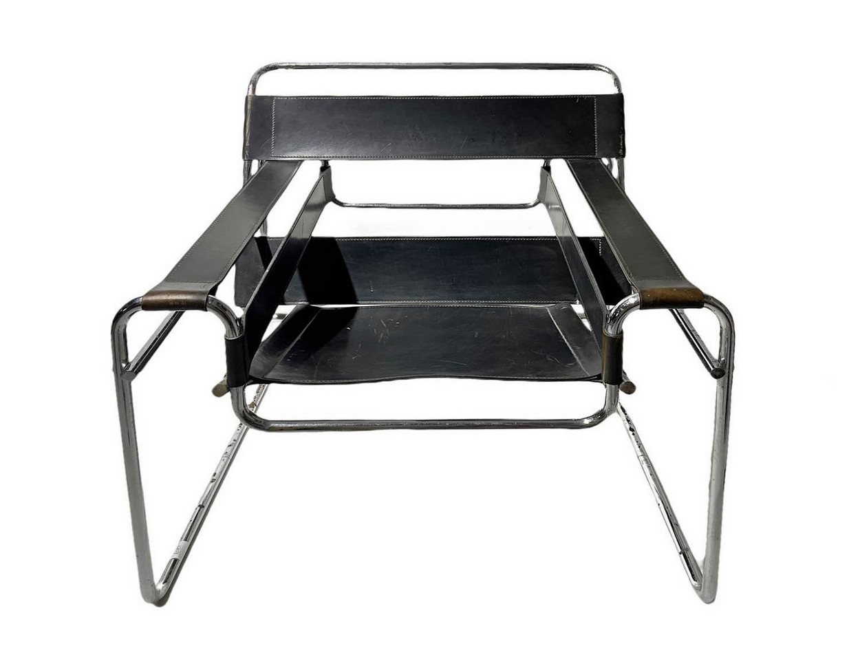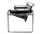 con struttura in metallo tubolare cromato, seduta e spalliera a fasce di cuoio di forte spessore nei torni del nero. Salti di cromature