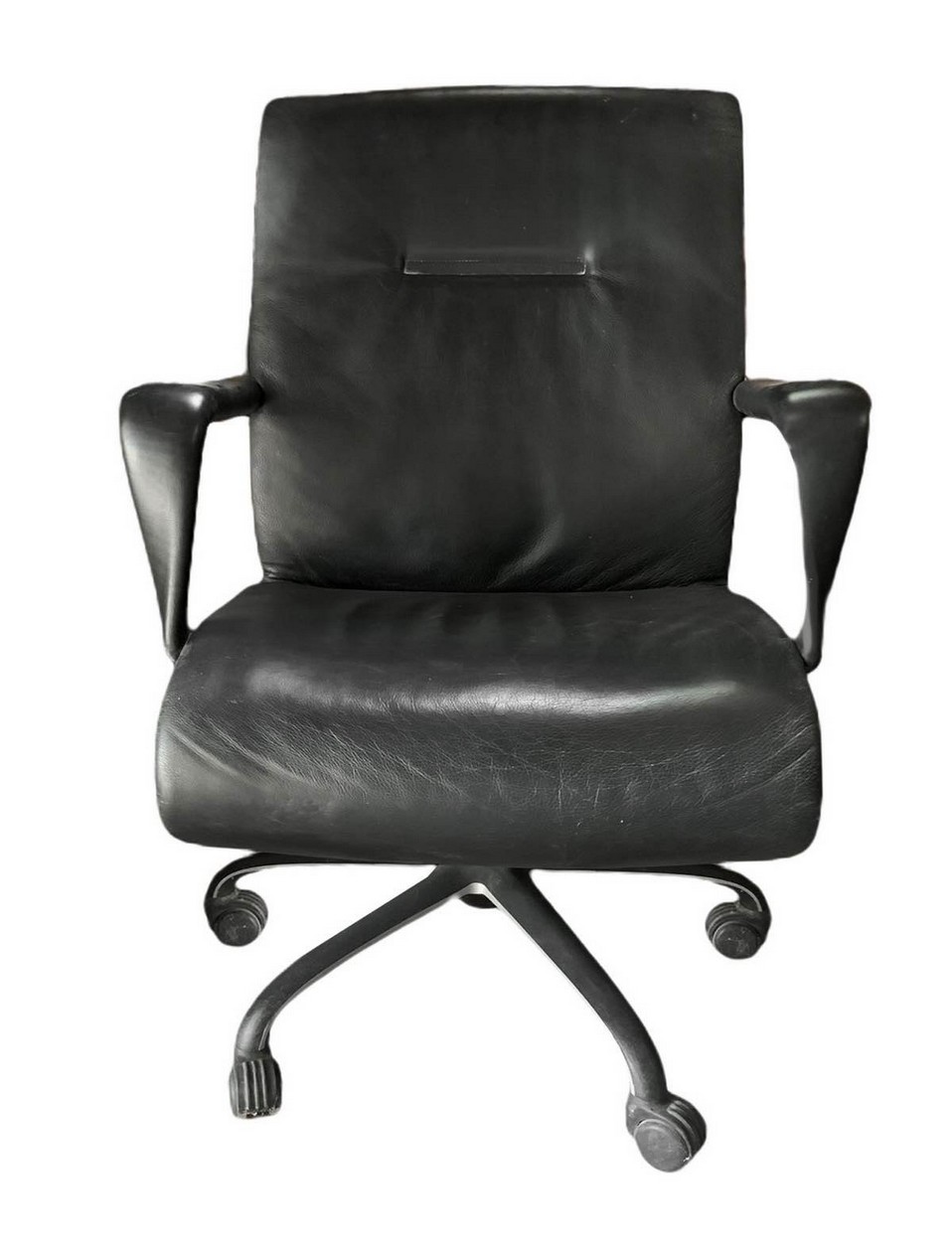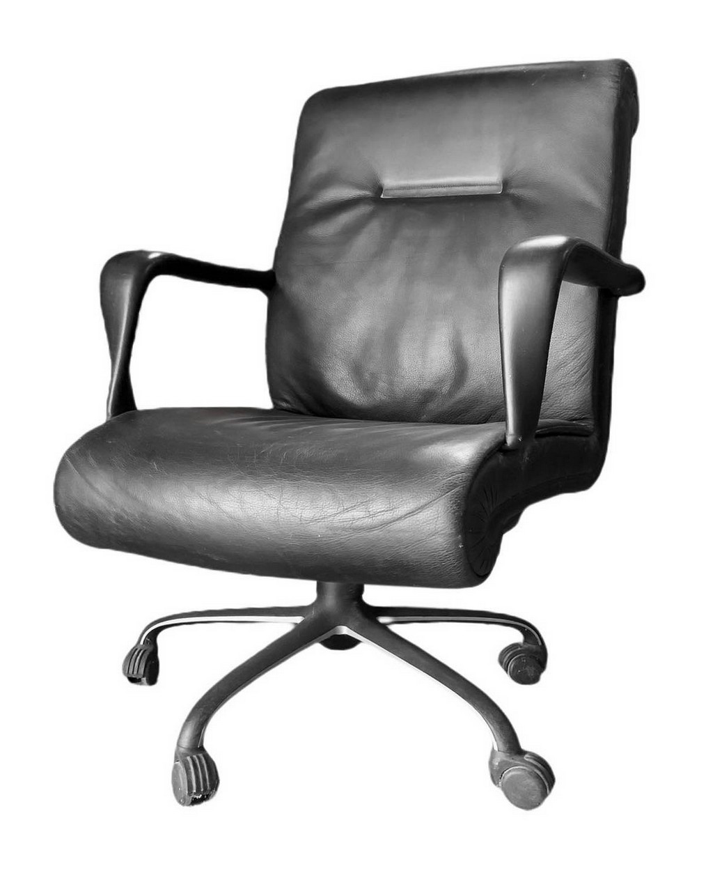 Design Centre per Poltrona Frau - Poltrona modello Forum, disegno Design Centre, 90's H cm 95, cm 64x68 Struttura del piede in alluminio a cinque razze, rivestimento in pelle color nero.Struttura del piede in alluminio a cinque razze, rivestimento in pelle color nero.