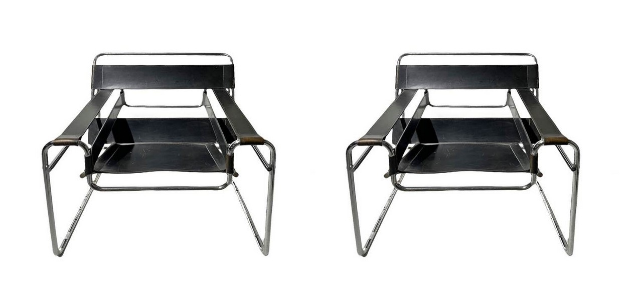 Gavina (1960) - Coppia di poltrone,disegno Marcel Breuer, modello Vassily, 1980s H cm 75, cm 76x70 con struttura in metallo tubolare cromato, seduta e spalliera a fasce di cuoio di forte spessore nei torni del nero. Salti di cromaturecon struttura in metallo tubolare cromato, seduta e spalliera a fasce di cuoio di forte spessore nei torni del nero. Salti di cromature