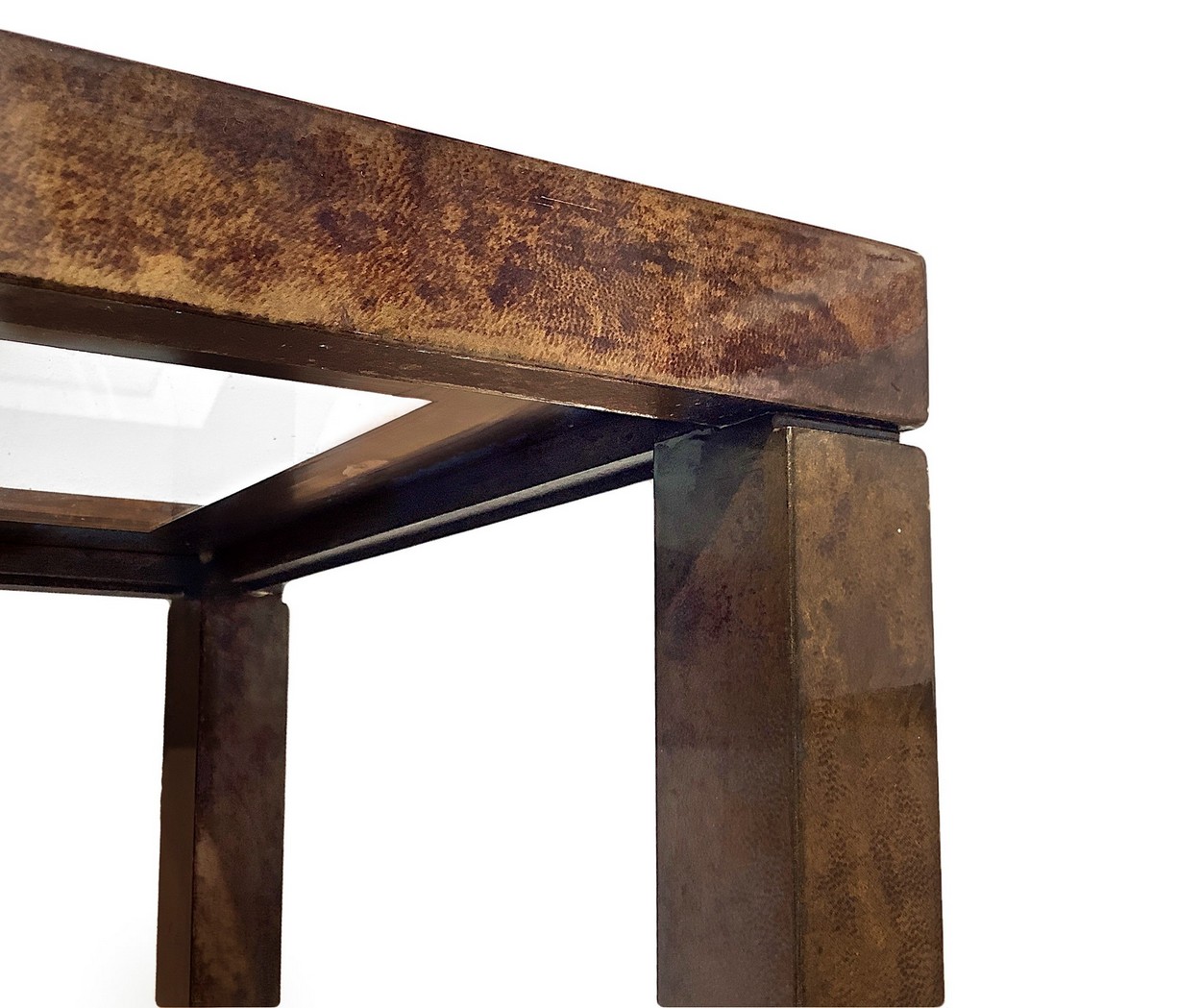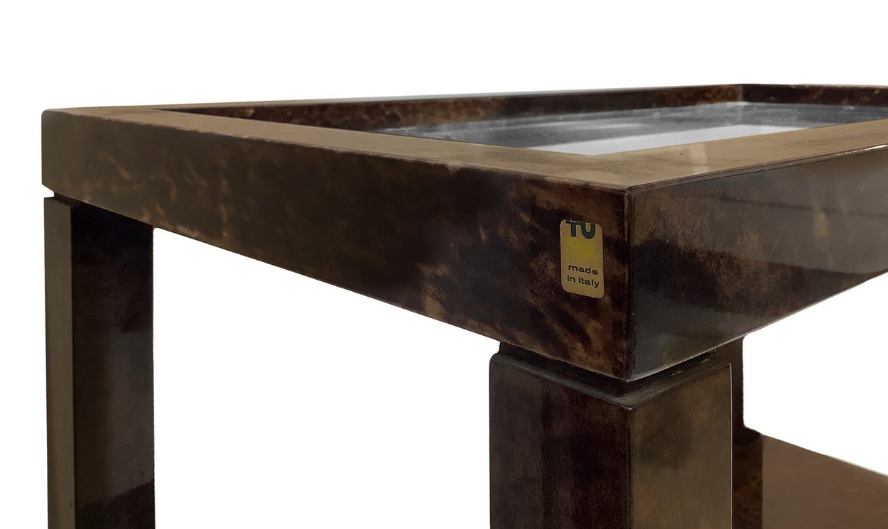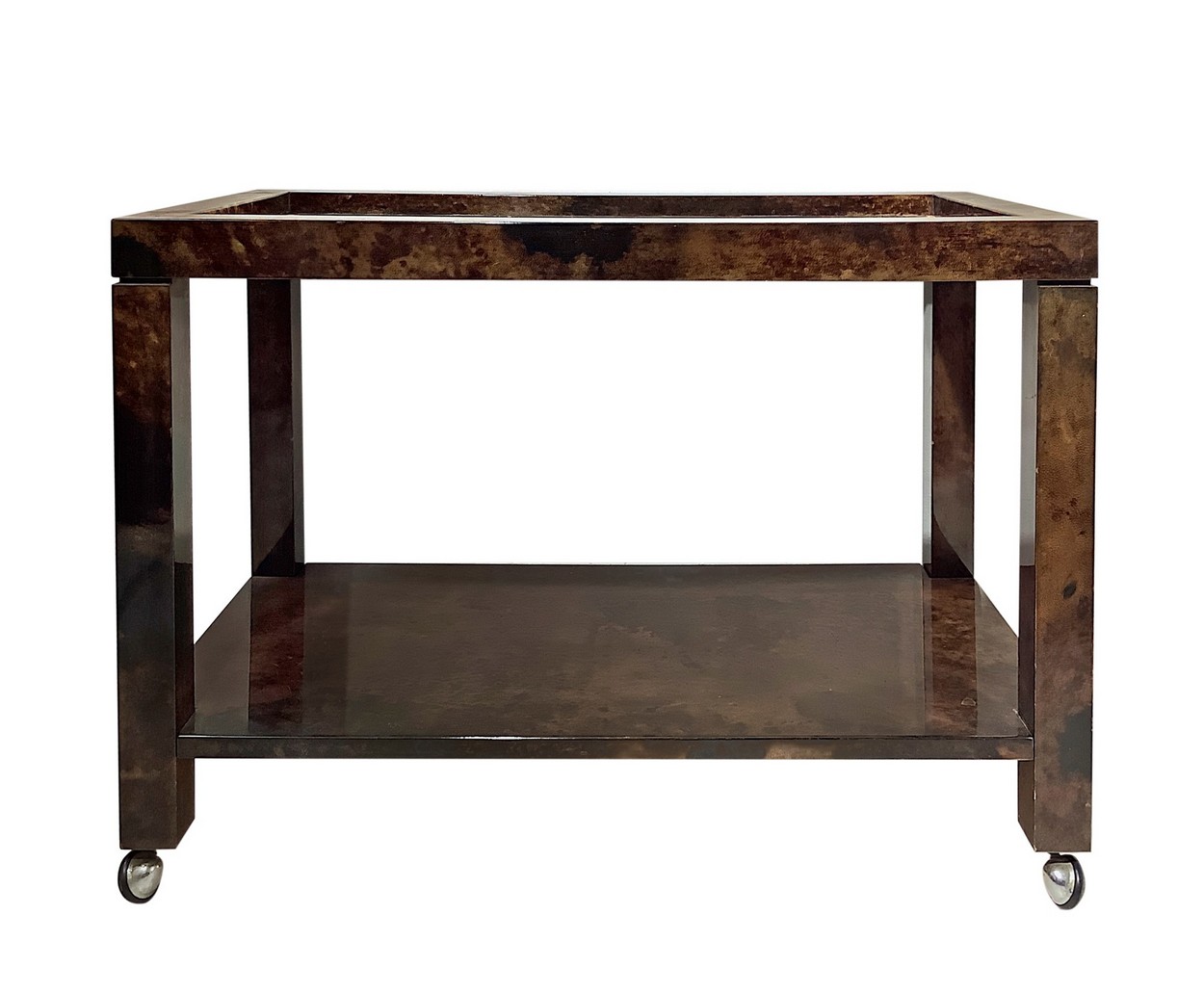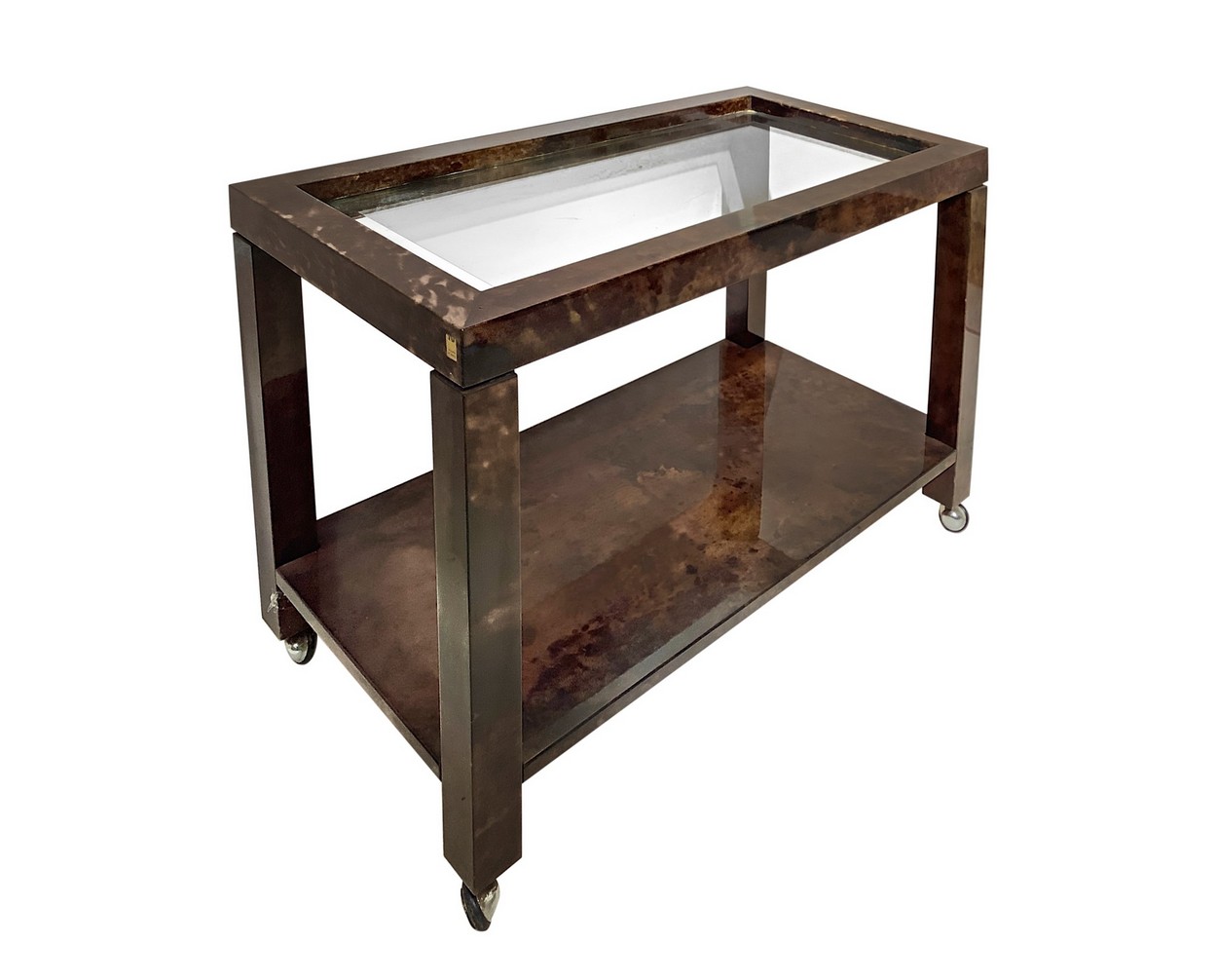 Aldo Tura (1909-1963) - Carrello portavivande H 60 cm, 85x45 cm Struttura in legno e rivestimento in pergamena acrilicata nei toni del marrone. Piano in vetro con bordo specchiatoStruttura in legno e rivestimento in pergamena acrilicata nei toni del marrone. Piano in vetro con bordo specchiato
