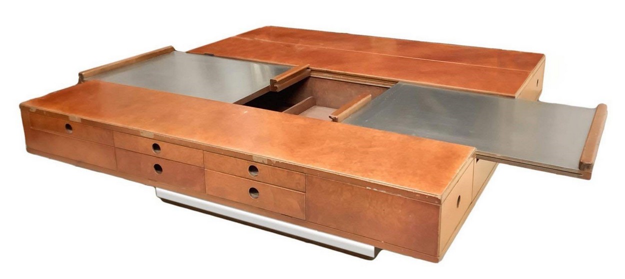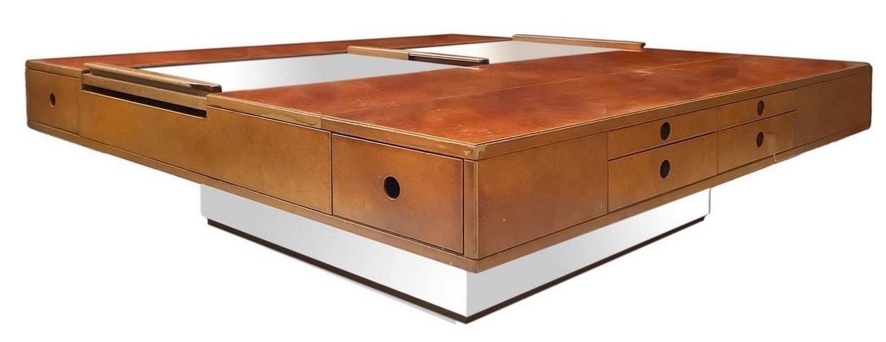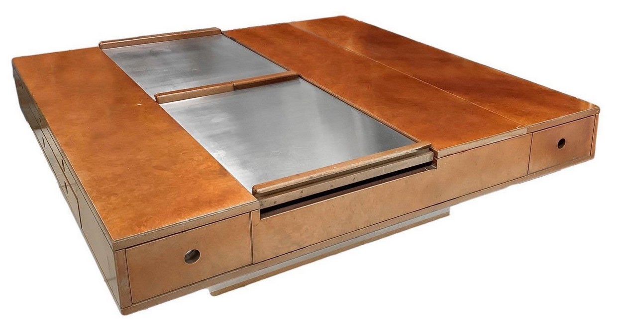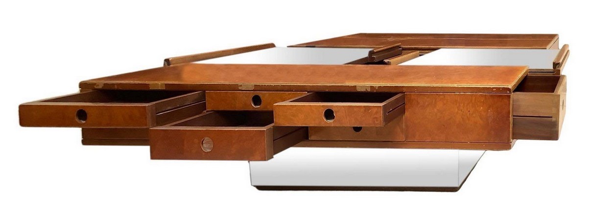 Produzione italiana attribuibile Guido Faleschini. Tavolo basso in legno rivestito in radica di erica. H cm 40 x 130 x 130. Dettagli in alluminio lucido. Segni di uso lungo il piano e sulle ante. Segni d'uso