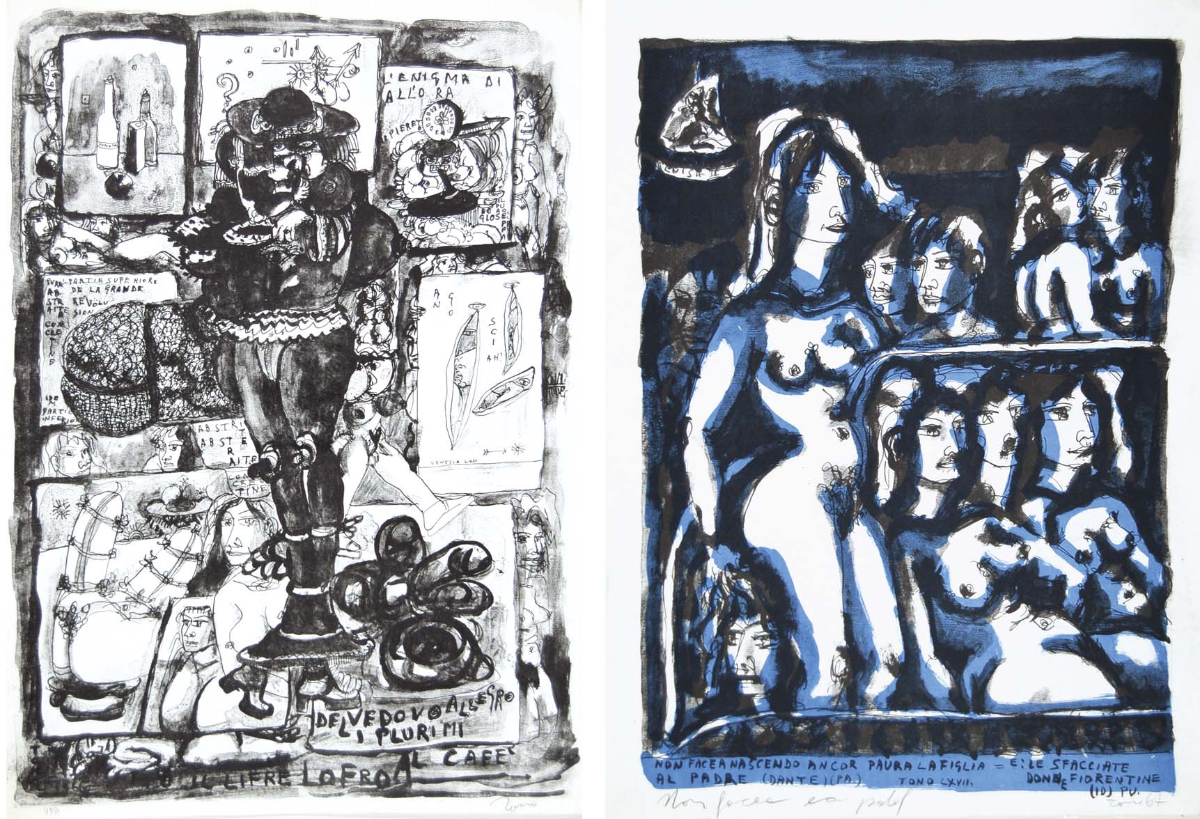 ZANCANARO TONO Padova 1906 - 1985 Soggetti vari lotto di 2 litografie: Il Lifro Lofro al caffè 1966 es. 79/80 - Non facea nascendo ancor paura la figlia 1967 cm 70x50 - 60x44,5 entrambe firmate e datate autentica dell'Archivio Storico Tono Zancanaro a cura del prof. Manlio Gaddi nr. Arch. L66008 - L67018 - etichette al retro