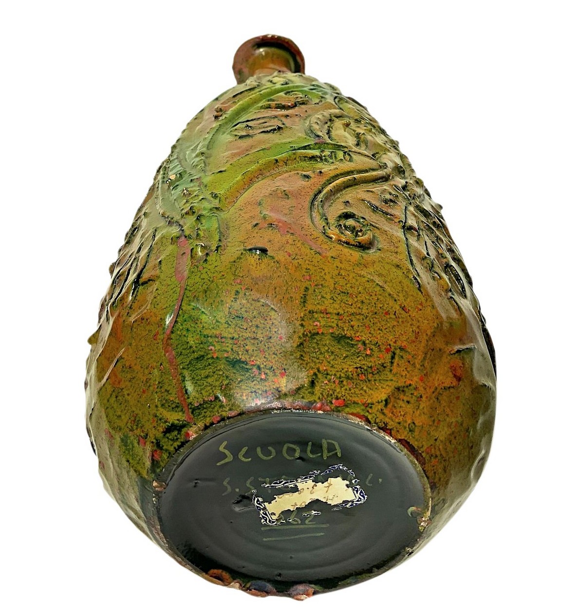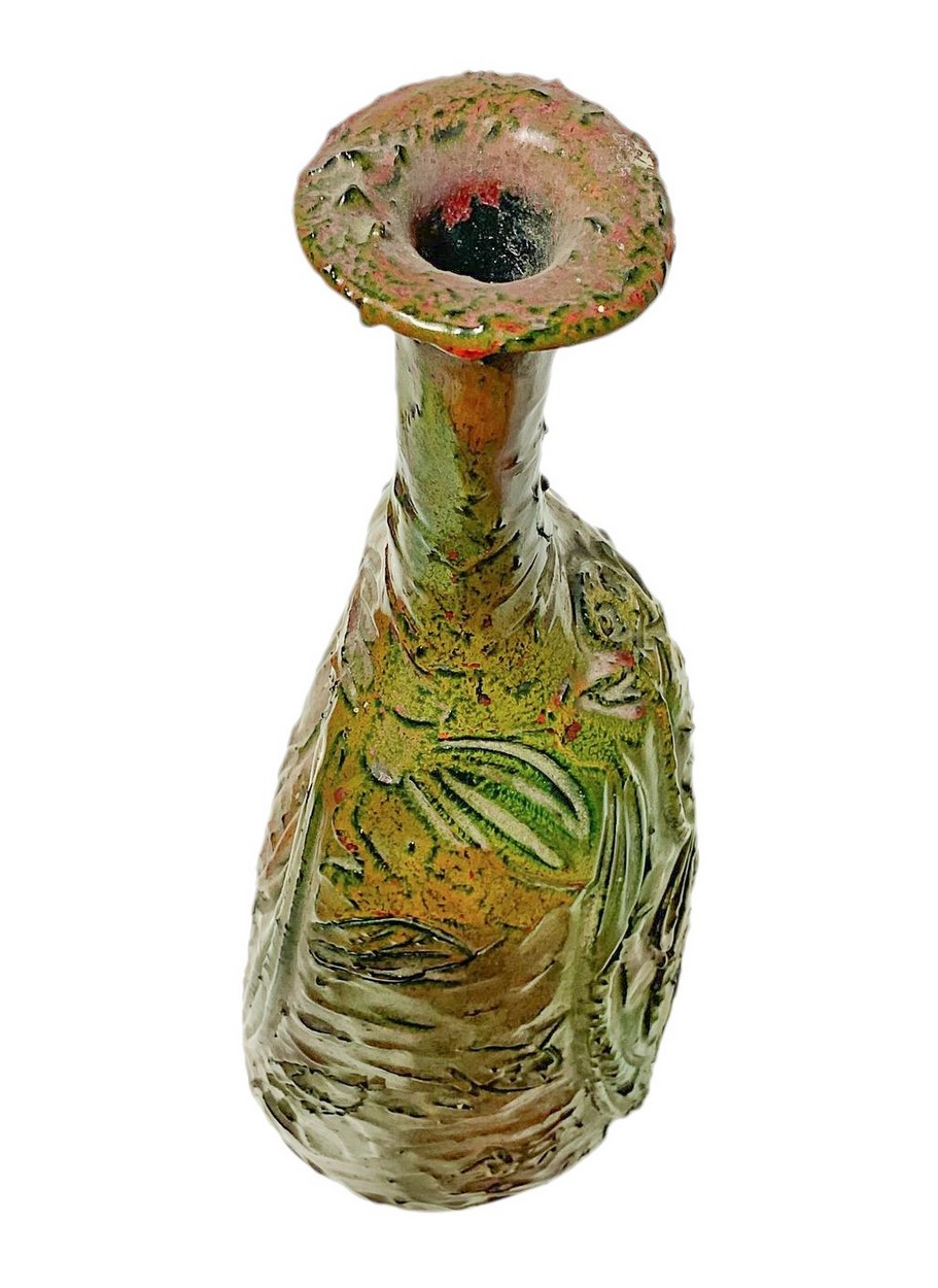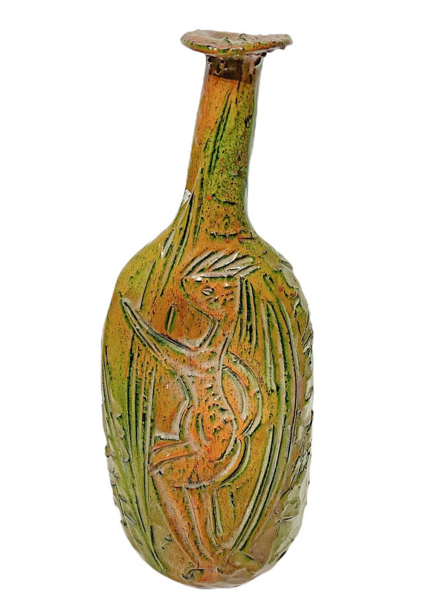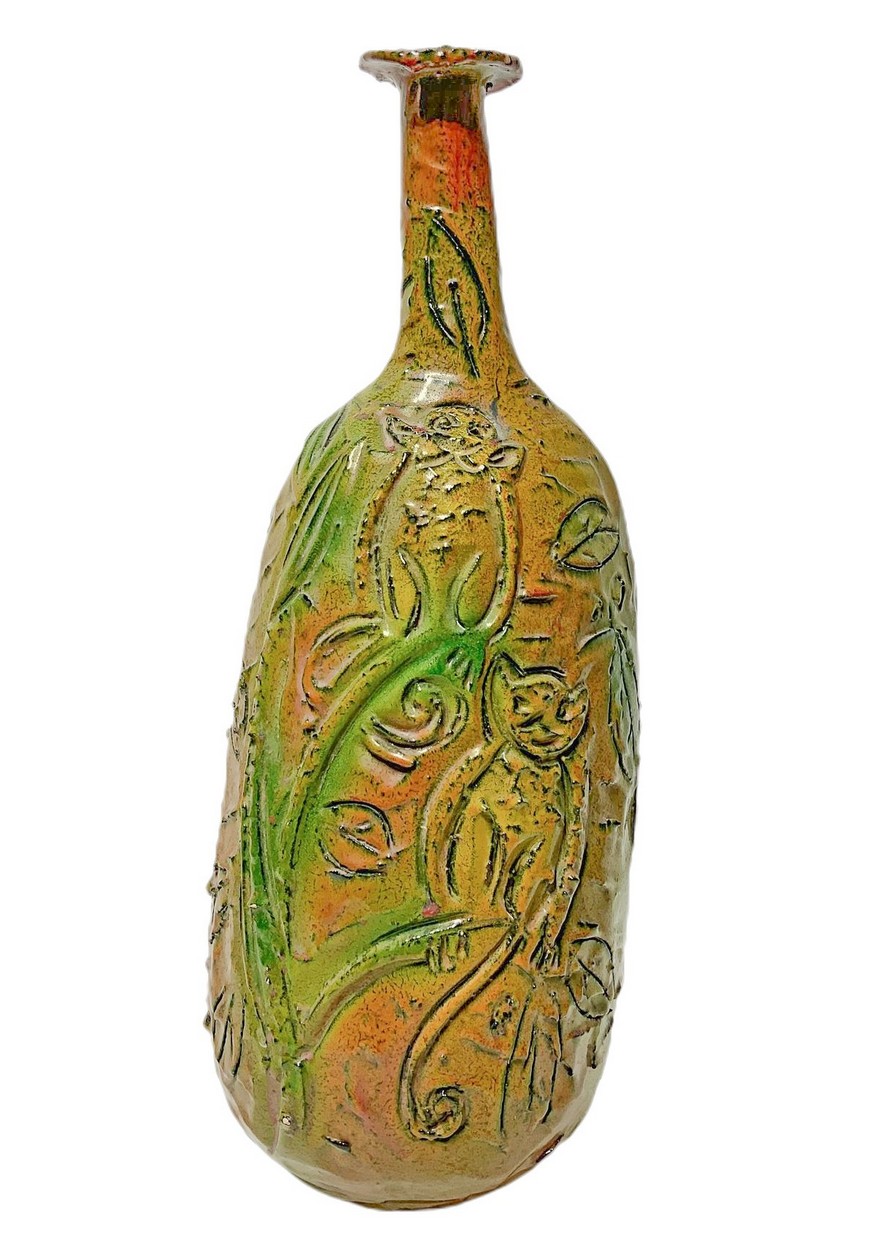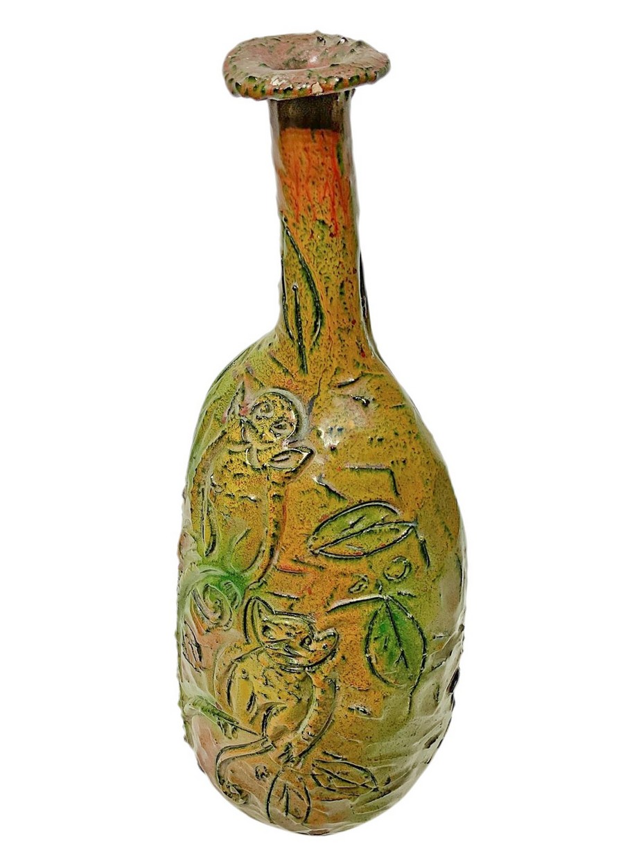 Produzione di Santo Stefano di Camastra, Italy H cm 45 Bottiglia in terracotta maiolicata di forma globulare con alto collo ed estroflessione alla sommità. Decorata nei toni del verde ramino e dell'arancione. Superficie riportante scena esotica eseguita a graffito. Bottiglia in terracotta maiolicata di forma globulare con alto collo ed estroflessione alla sommità. Decorata nei toni del verde ramino e dell'arancione. Superficie riportante scena esotica eseguita a graffito.