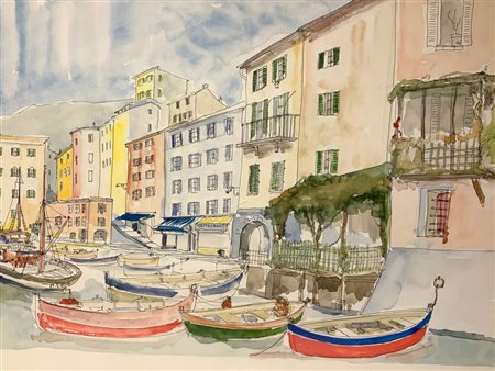 Max Dissar (Nizza 1908-Juan-les-Pins 1993) - Paesaggio marino con case Cm 50x70 Acquarello su carta Località Camogli. Firmato in basso a destra e datato '67.
