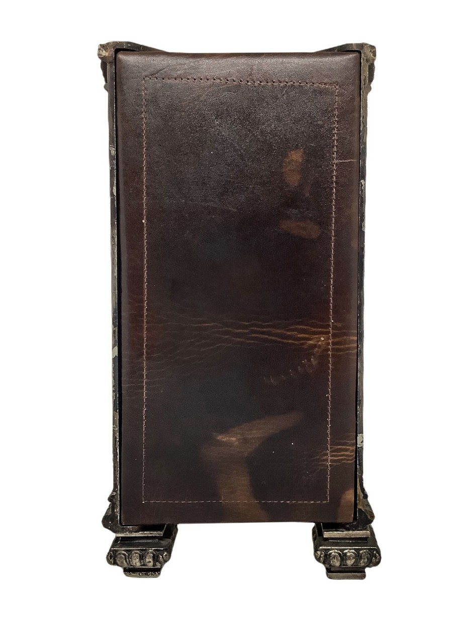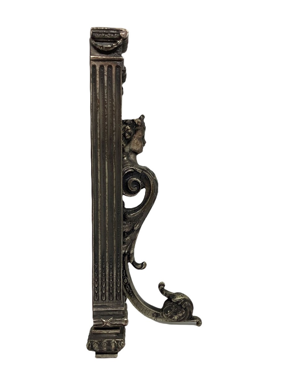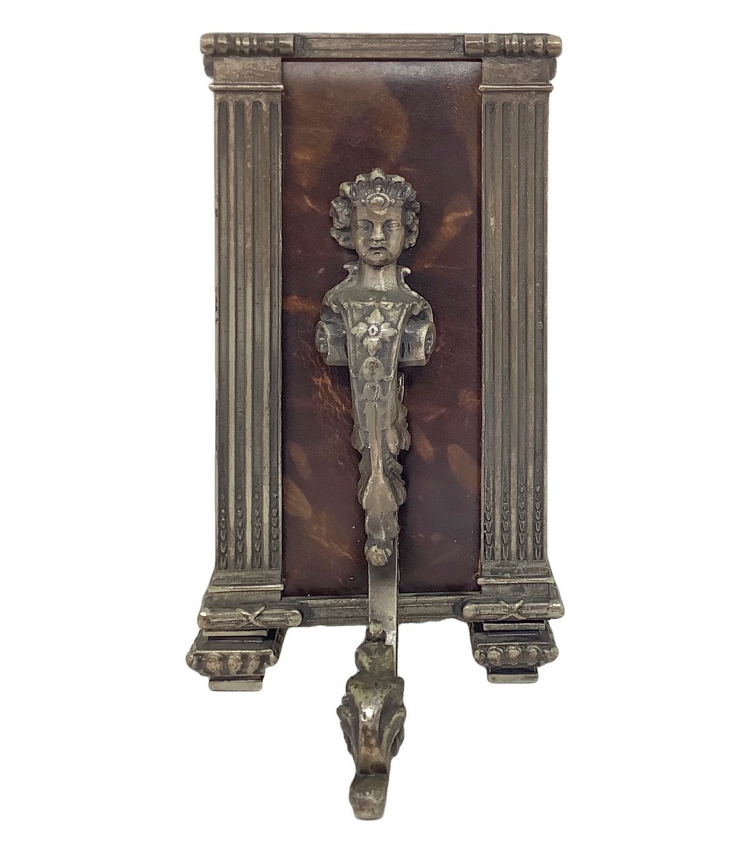 Fermalibro in metallo argentato e cuoio, con Erma Muriebe H 25 cm, 13x10 cm