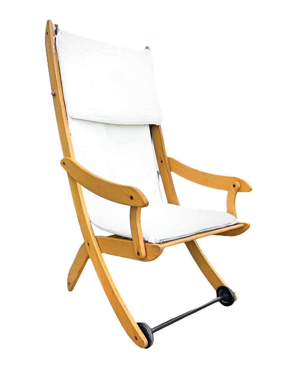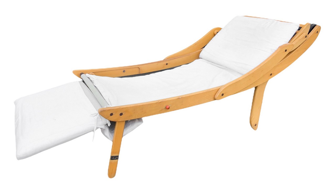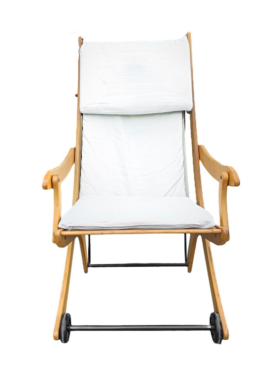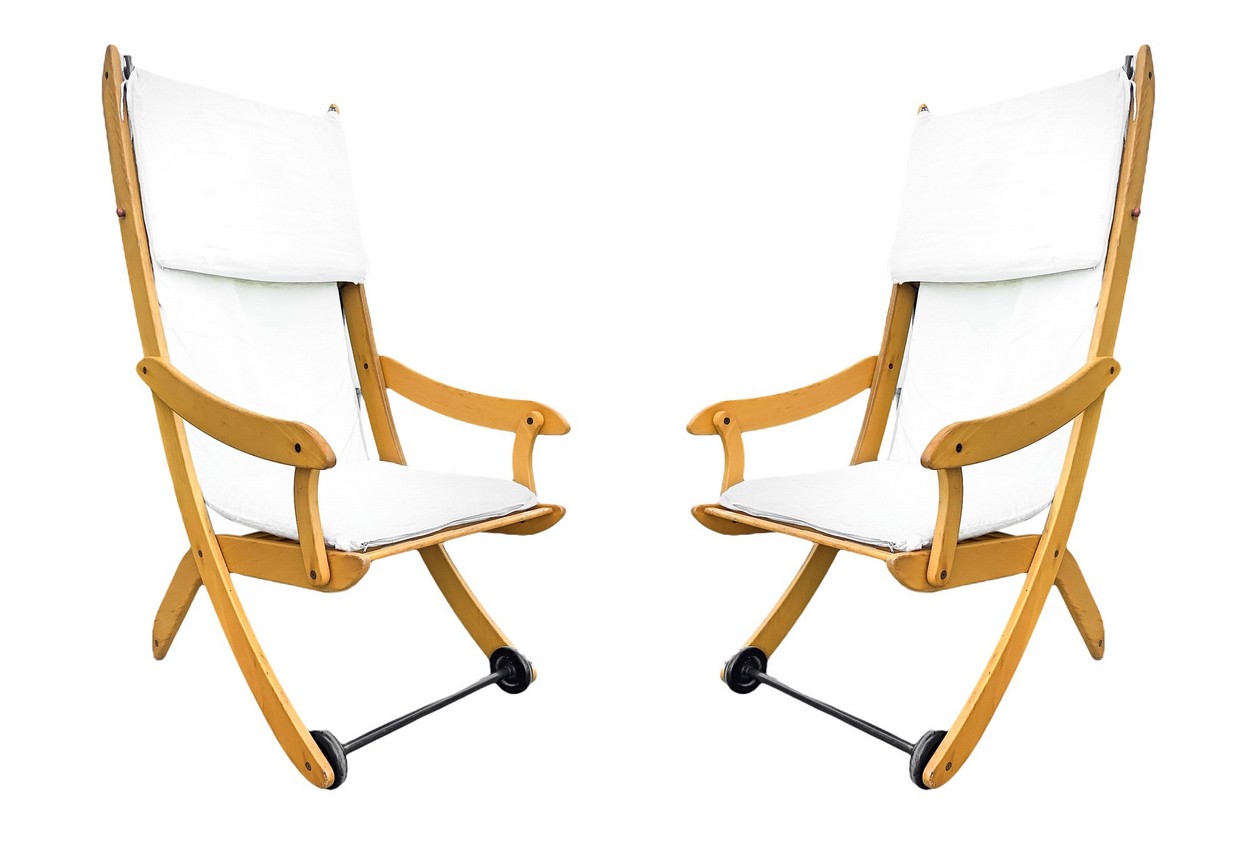 Coppia di sedie/sdraio da giardino reclinabili, Italy H cm 128. Larghezza cm 65. Profondità cm 65 Struttura in legno di acero, seduta in tessuto. Produzione italiana. Segni di uso e strappi. Struttura in legno di acero, seduta in tessuto. Produzione italiana. Segni di uso e strappi.