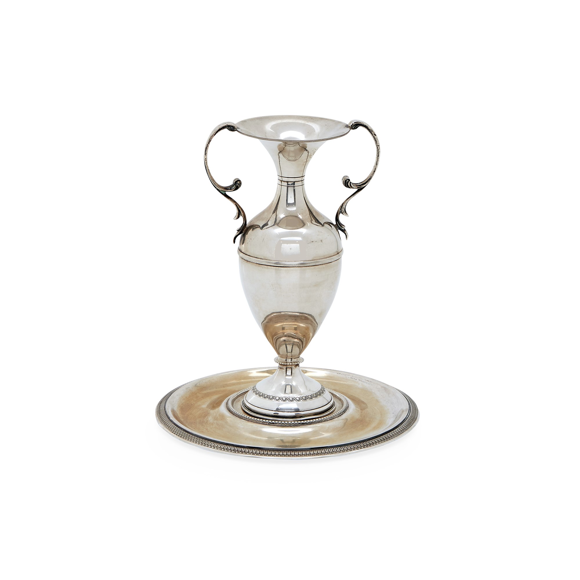 composto da un vaso a forma di anfora con manici e piatto sottovaso.