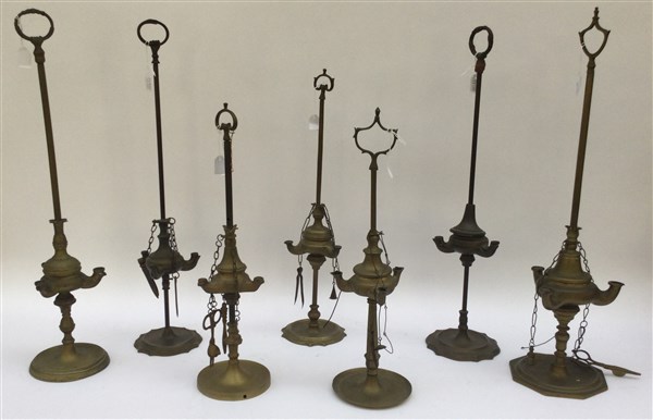 Lotto composto da sette lampade fiorentine in bronzo con coppa a tre fiamme, di cui cinque con accessori. Presa ad anello sagomato. Epoche diverse (h. max cm 58) (difetti)