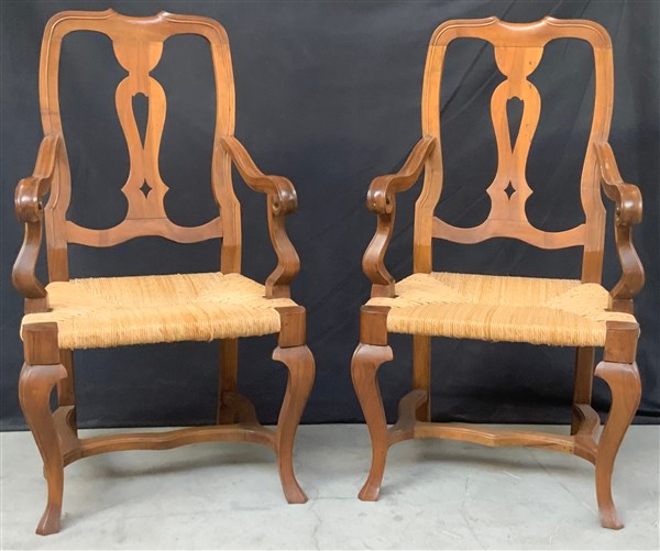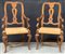 Coppia di poltrone di forma mossa in legno intagliato, schienale traforato, braccioli terminanti a ricciolo, gambe riunite da traverse. Secolo XIX (lievi difetti)