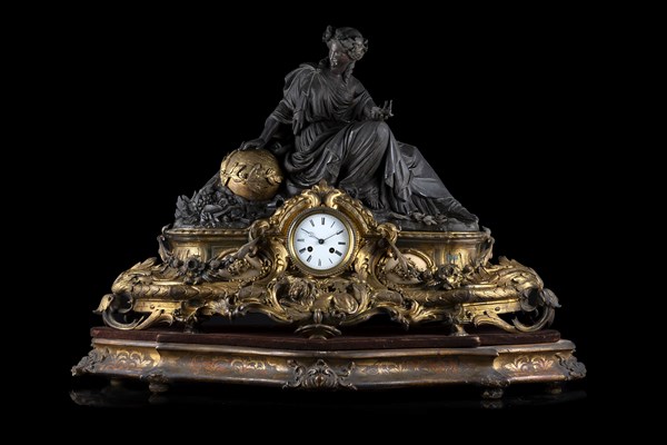 Bronze, metal and marble clock depicting the Allegory of Progress, on a wooden base.