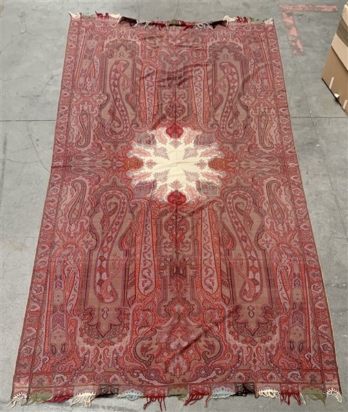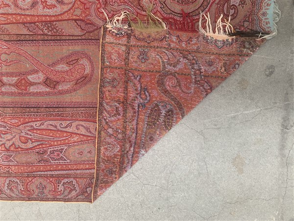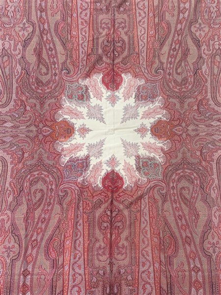 Scialle Kashmir, Inghilterra, seconda metà del secolo XIX. Tessuto a mano con telaio a tiranti, in lana. Riserva centrale bianca, invasa da decorazioni con motivi floreali (cm 317x158) (lievi difetti)