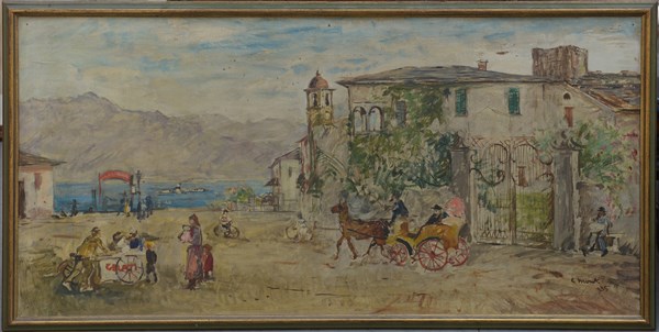 "Borgo sul lago" olio su compensato (cm 72x145) Firmato e datato 1935 in basso a destra. In cornice in legno laccato e dorato (difetti)